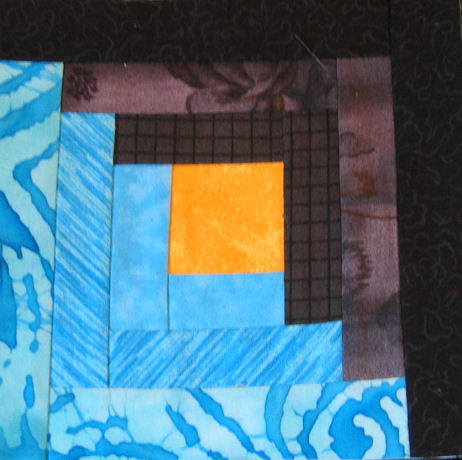 Here’s part of a completed block—each ‘log’ in the cabin is a finished 3/4″ wide, and the ‘log fire’ for all blocks is a yellow square.