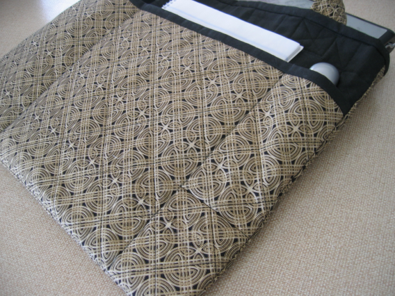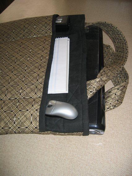 Solution: I created a quilted laptop bag using some really nice Celtic fabric I had! Problem solved — I can now grab this bag out of the larger carry-on bag, and have ready the power supply, mouse, and even space for a notebook and pen… all without disturbing others and without ending up with the big bag on my head!