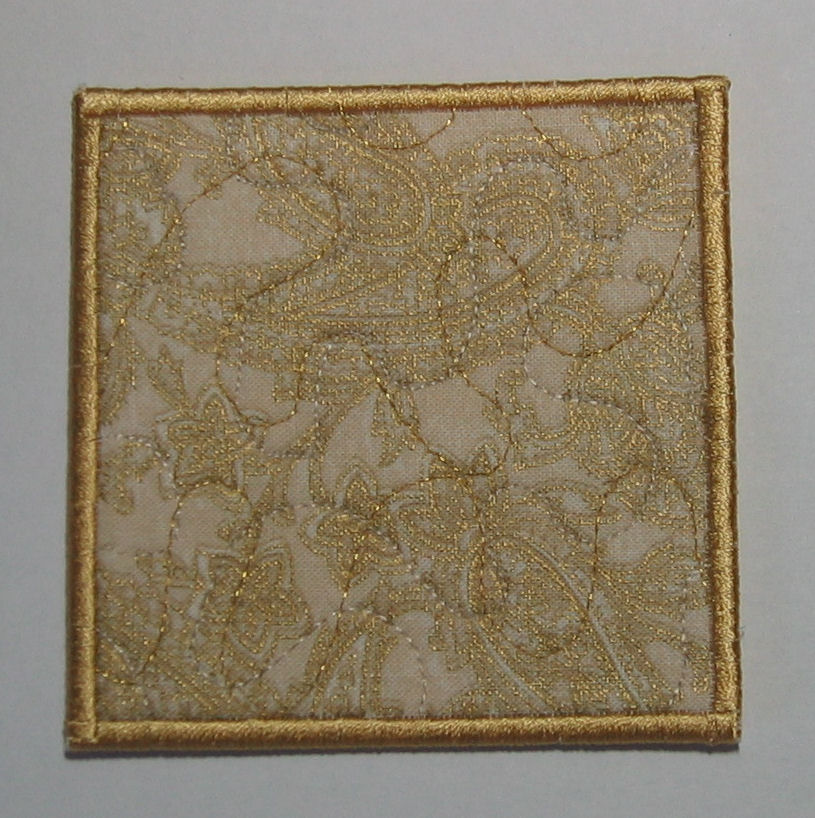 For each main fabric, I did one set of four coasters in gold metallic thread. But metallic thread — while pretty — is a sod of a thing to use even with a topstitch needle…