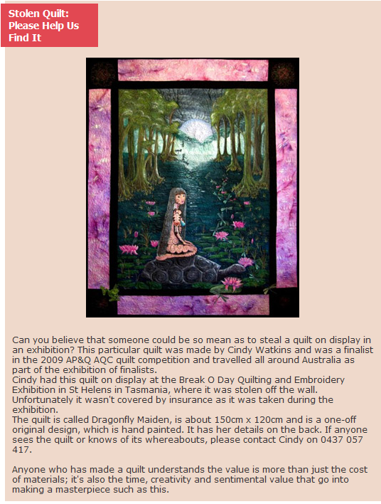 I saw this plea to find a stolen quilt in the CraftLovers.com newsletter. It seems the quilt was stolen from an exhibition in St Helens, Tasmania. Details below of who to contact etc. if you see it anywhere.