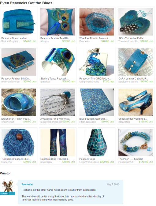 I woke this morning to a message from FaerieKat that she’d included my blue peacock feather journal cover in her GORGEOUS Etsy Treasury.