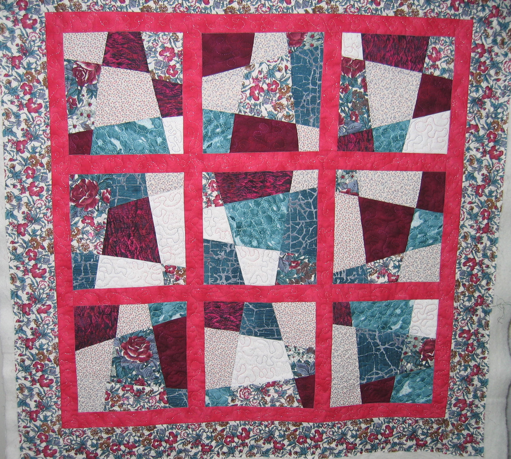 I ended up with nine crazy 9-patch blocks, then sewed sashing strips to them, then sewed them all together to make the quilt top. I added a border, then created a quilt sandwich with the top, batting, and a backing fabric.