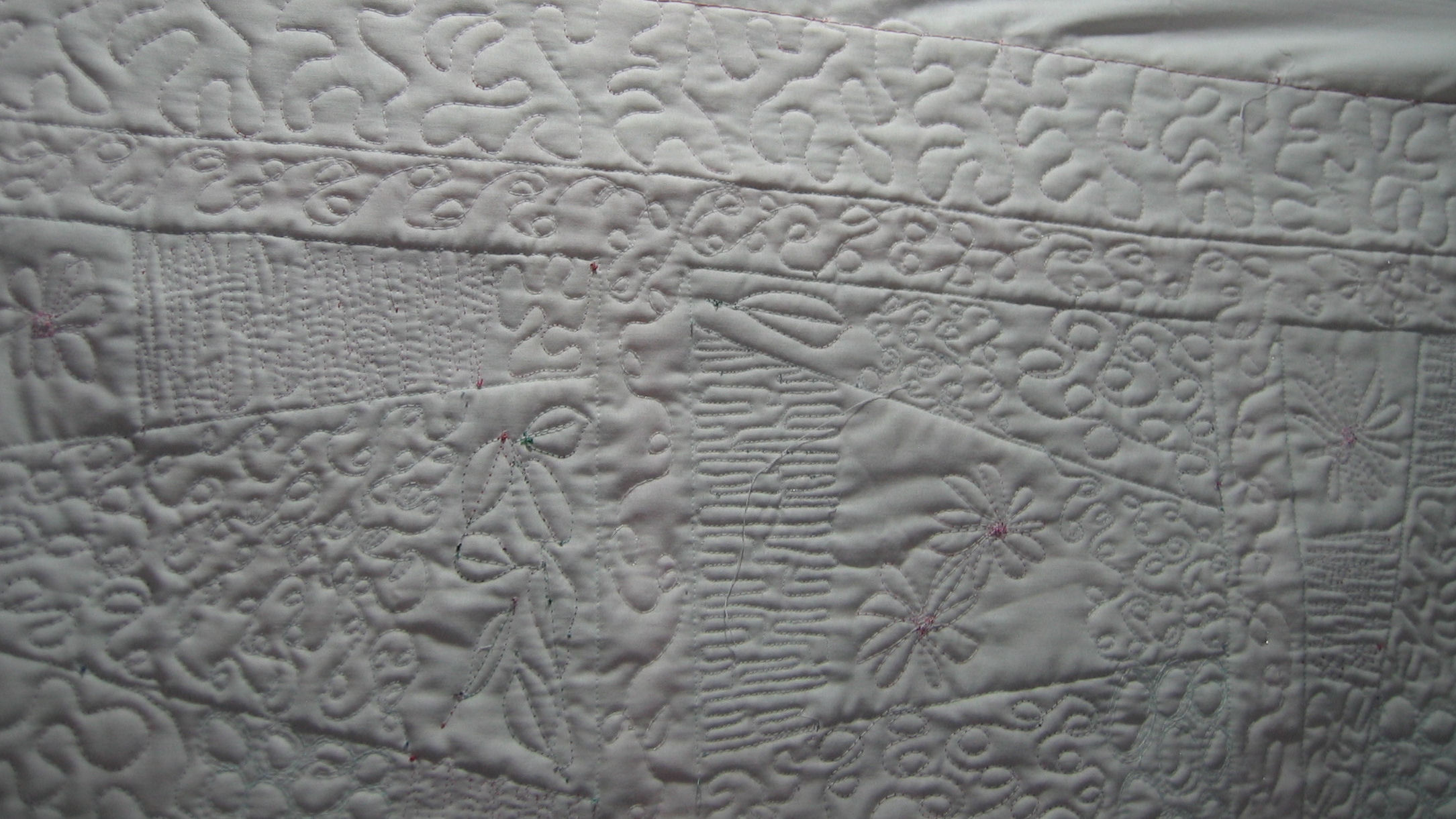 Next came the quilting! following the ‘nine’ theme, I used 9 different free motion stitches — one different stitch for each fabric, plus extras for the sashing strips and the outer border.