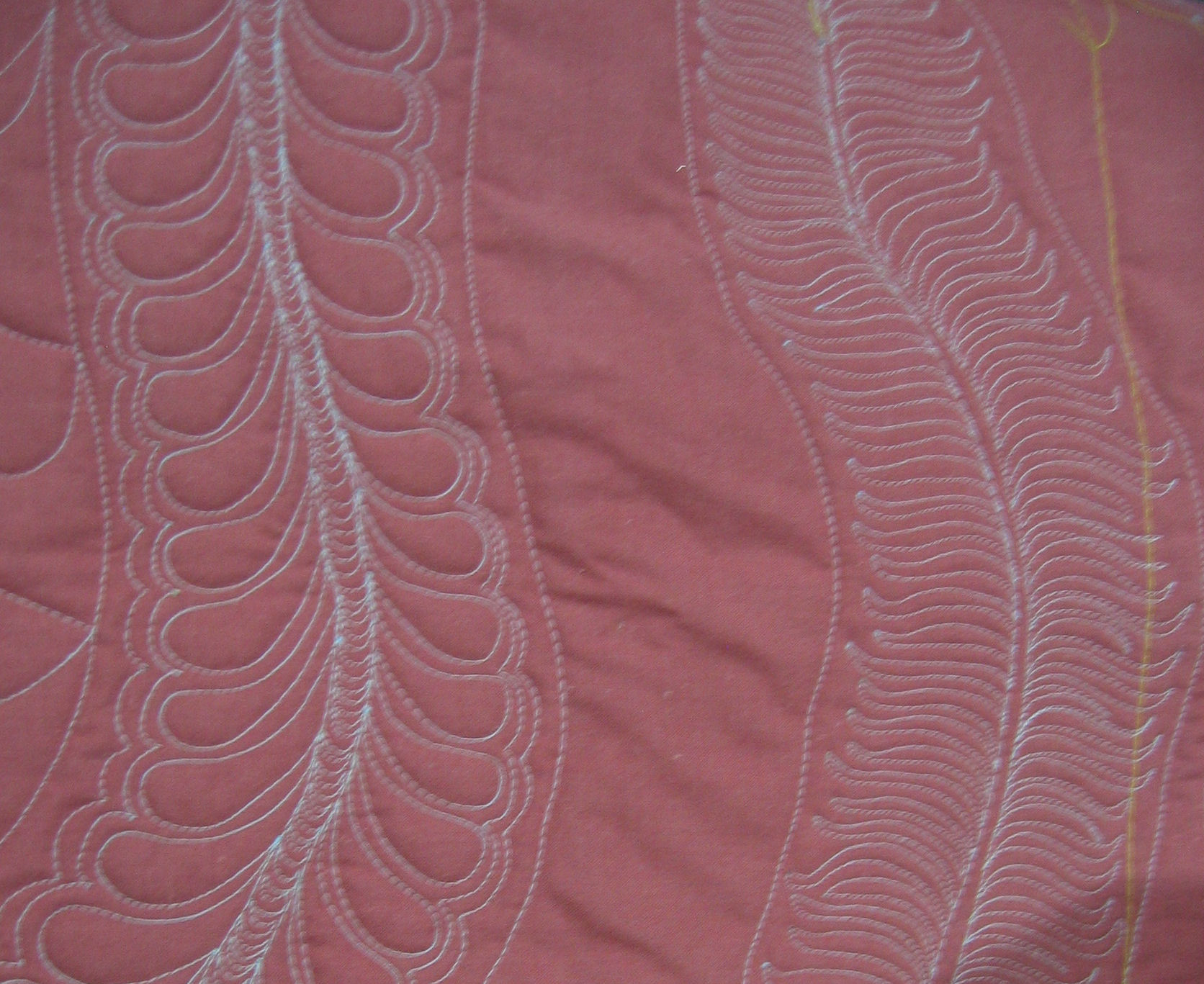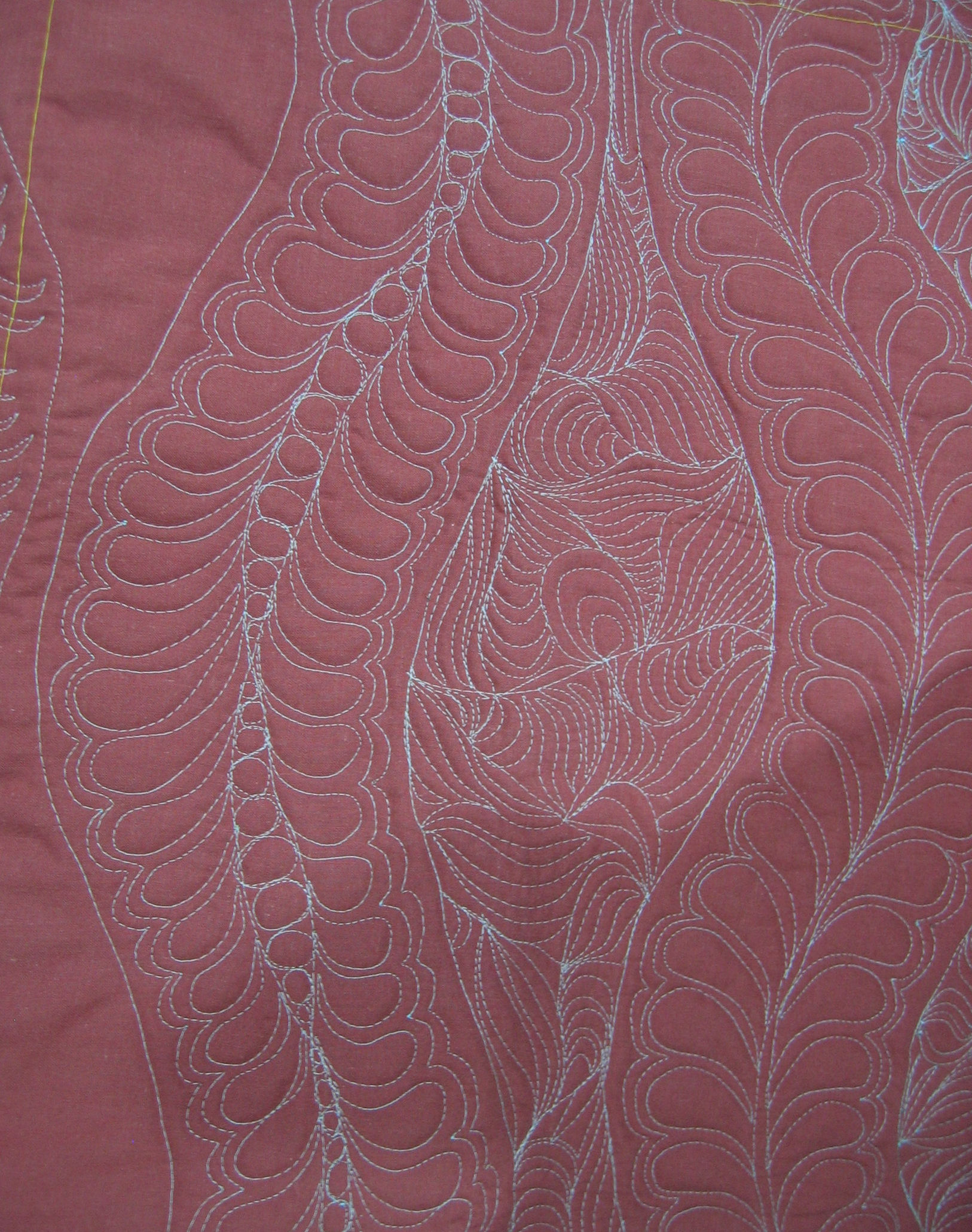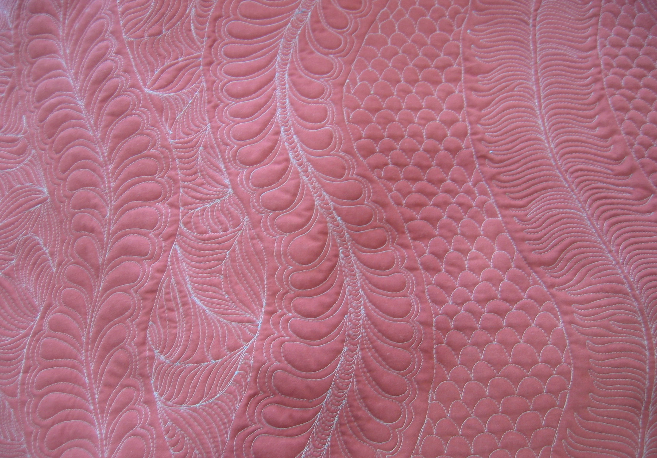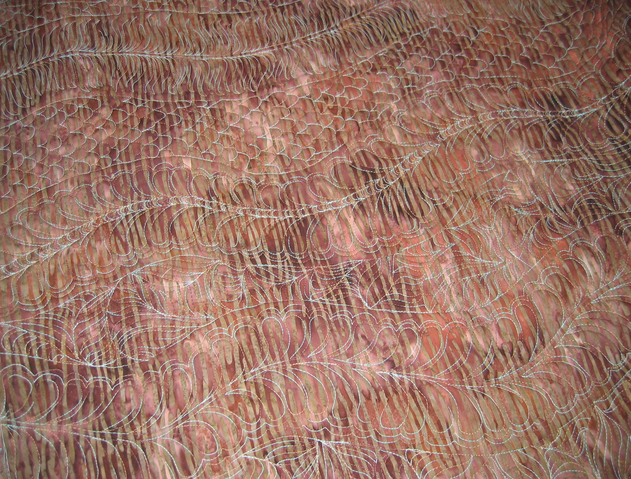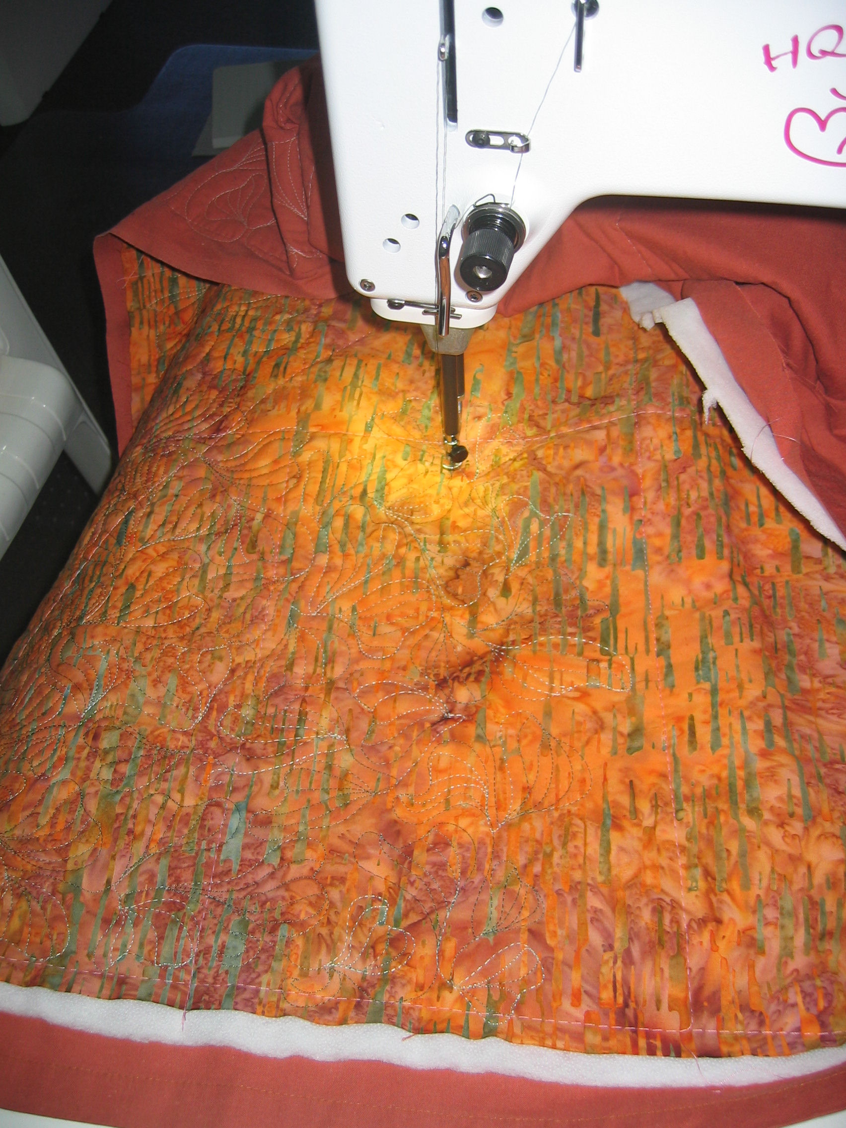 The quilting motif I’ve used on that square metre of orange batik is based on the crocus designs from Leah Day and her free motion quilting project. It’s a design I find really easy to do and is a great filler design for all sorts of large and small areas.