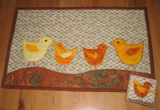 The first piece I quilted with my new HQ Sweet Sixteen was a gift — a table runner/place mat for Kelli. Kelli has just moved from Arizona to Colorado — new home, new job, new phase of her life — and one of the things she wants when she gets settled is some chickens. She’d asked me if I could make a table runner/place mat to match the chicken coasters I have for sale in my Etsy store, and how much would it be.