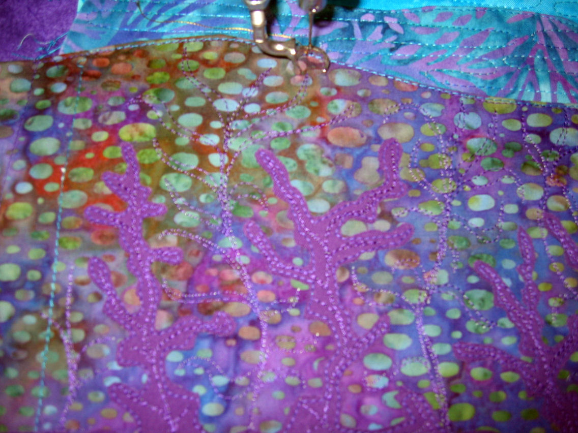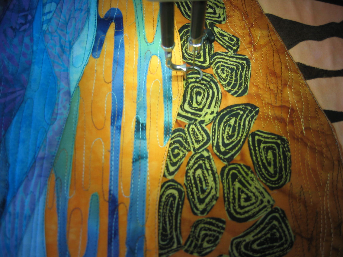 - Add surface stitching to the piece, as required. I used my HandiQuilter Sweet Sixteen machine and free motion stitched some 15,813 stitches to the piece during this step! I added flames to the base of the trees and earth, bark to the trees, striations to the earth above the rocks, spirals to the rocks, water effects to the water reflections and waves, more seaweed to the sea floor, etc.
