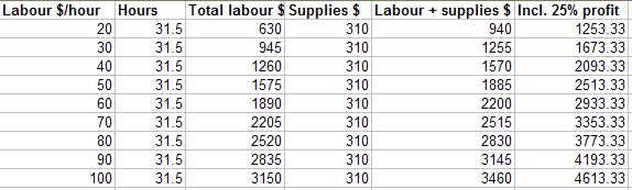 Let’s do some more sums, assuming fixed costs for the supplies ($310) and a fixed profit margin (25%) but changing the labour rate: