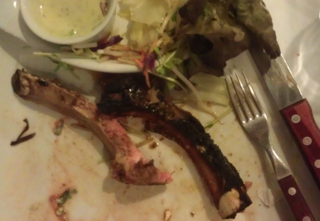 Dinner was at Rustler’s Steakhouse. We started with a single serve of four beef and field mushroom croquettes with a plum sauce that we shared. Then I repeated last year’s meal by ordering the rib eye steak on the bone, medium-rare, with blue cheese butter. My husband also had the rib eye on the bone, but with a mushroom sauce. Our steaks were just fabulous. They were cooked to perfection, had plenty of flavour, were tender, and had a lovely (but not overpowering) char flavour. The blue cheese butter complemented my steak perfectly. It was a big meal, but we got through it 😉 Before and after pics of my steak, below (and with my husband’s bone that I gnawed on — he’s not really into bones!). Sorry about the quality of the pics — I took them with the camera on my phone (still not used to it), while holding the phone above my head, and with no flash!