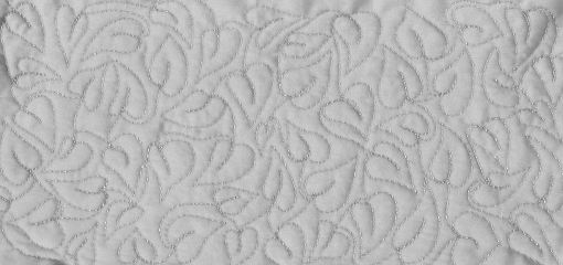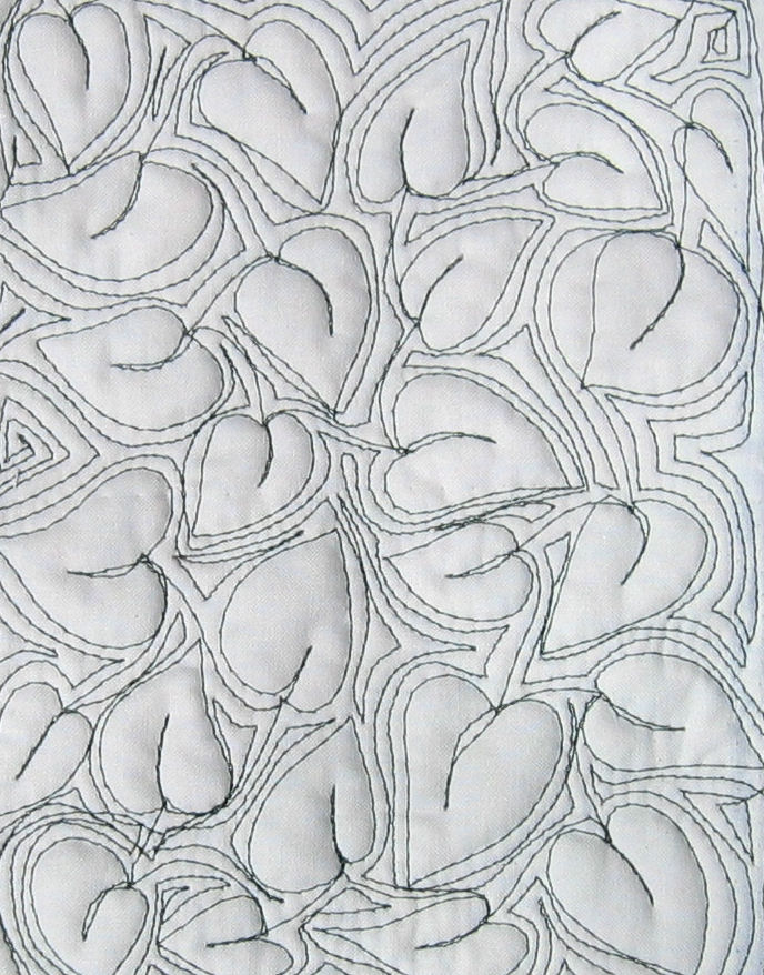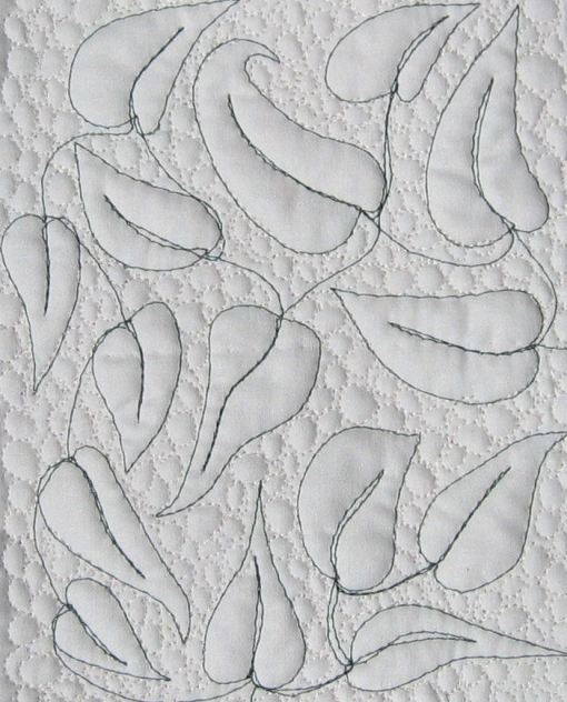 I elongated these leaves so they were more like eucalypt leaves, and made them stand out by flattening the background with very tight bubbles (a la Susan Brubaker Knapp’s approach). Dark green rayon thread with an off-white Deco-Bob thread for the bubbles.