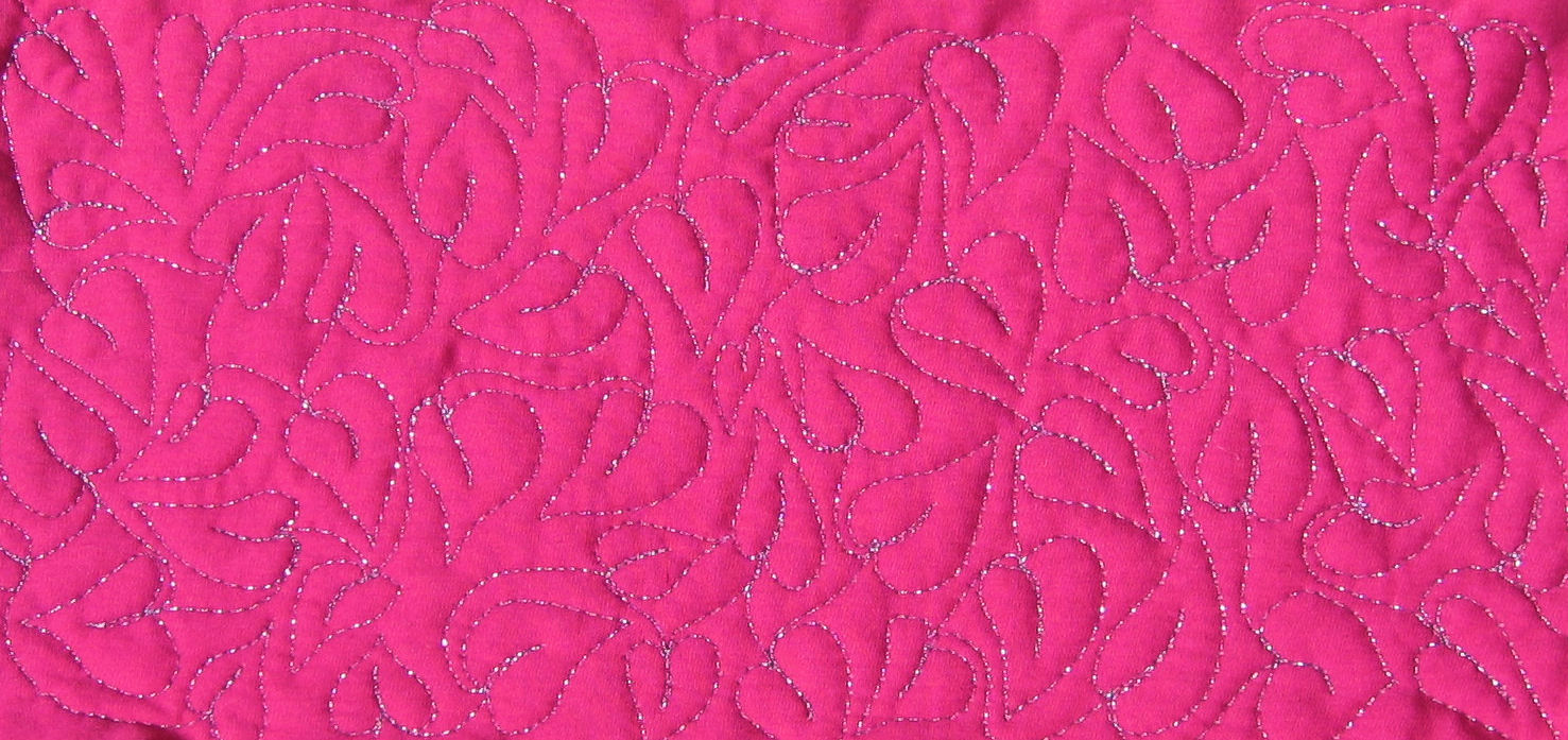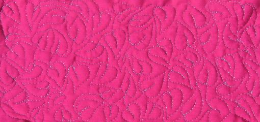 My final piece. I decided to get away from the off-white fabric and used a large scrap of bright pink cotton I’ve had for 25+ years! I just stitched basic leaves, but in silver to show the effect of metallic thread (Wonderfil) on a plain background.
