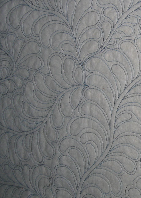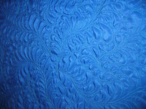 I’d seen the lovely pieces done by other participants in the FMQ Challenge on Facebook. Those that really stood out were stitched on satins and similar shiny fabrics. They photographed really well. So this afternoon I hunted out an ancient (30 years old?) piece of blue shiny fabric (like Shantung silk, but it wasn’t) and created some more feathers.