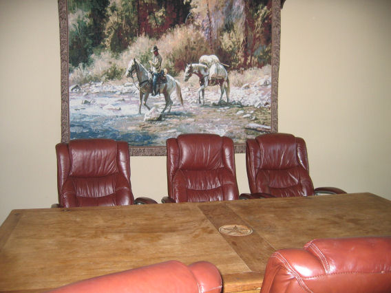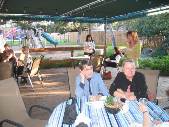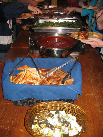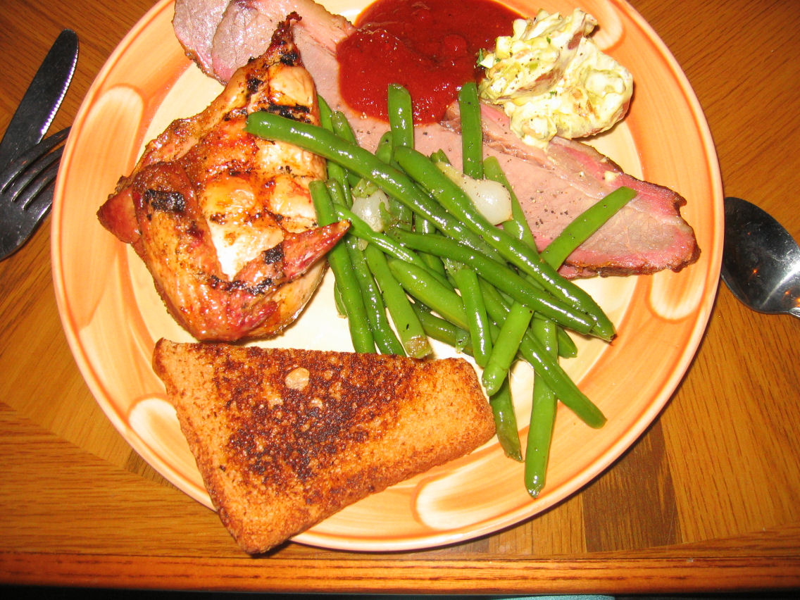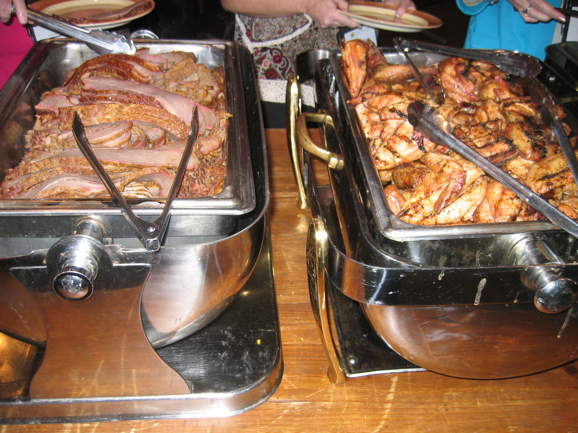 After drinks was a Texas BBQ dinner (not an open fire BBQ — more BBQ-style beef [brisket?] and chicken and a HOT sauce). Delicious.