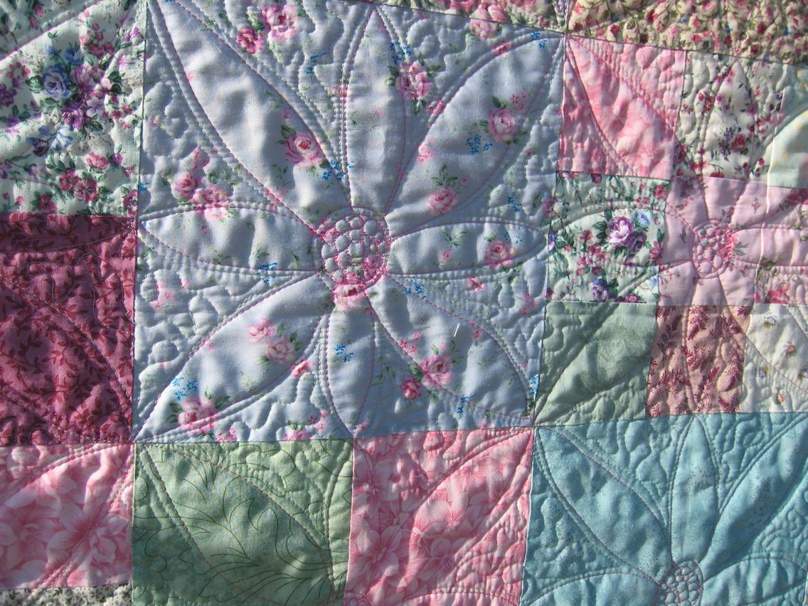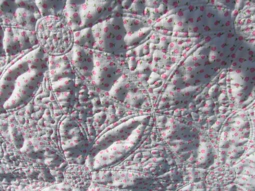 After I’d quilted the large flowers, I felt the quilt needed something to make those flowers pop. This quilting had to be subtle and reasonably dense to allow the flower petals to puff out. So I chose a soft green thread and echo quilted each petal in it, then filled the remaining space with a small-ish stipple in the same green thread. The backing fabric was pretty pink floral on white, so I used a soft pink in the bobbin. I was glad I decided to echo quilt the petals as I think that adds quite a bit of subtle emphasis to the petals.