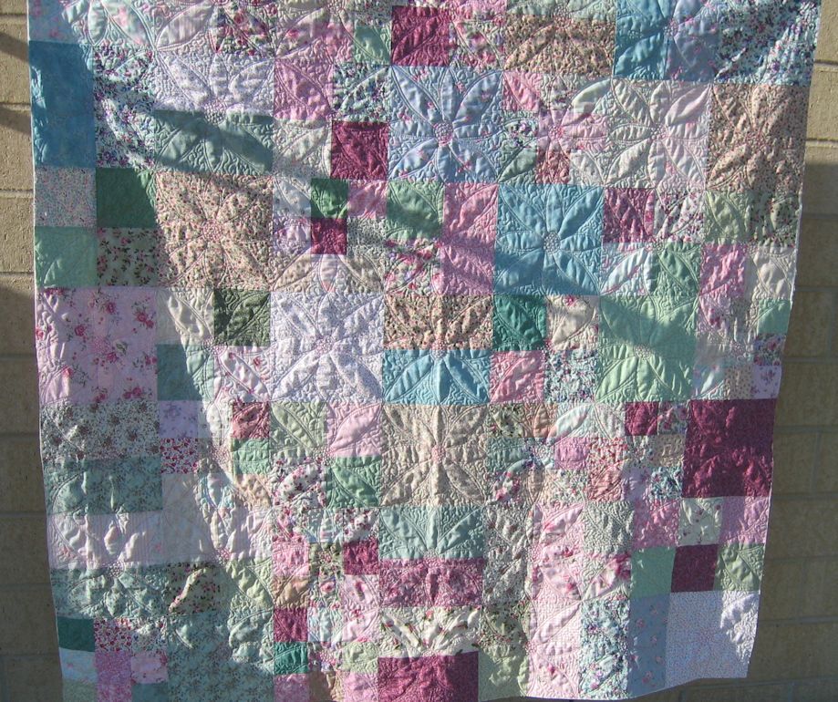 This quilt top had lots of pinks and greens and florals. It also had a lot of even 9″ blocks — some full pieces of fabric, others of half pieces, while the remainder were 4- or 9-patch blocks. What to do?