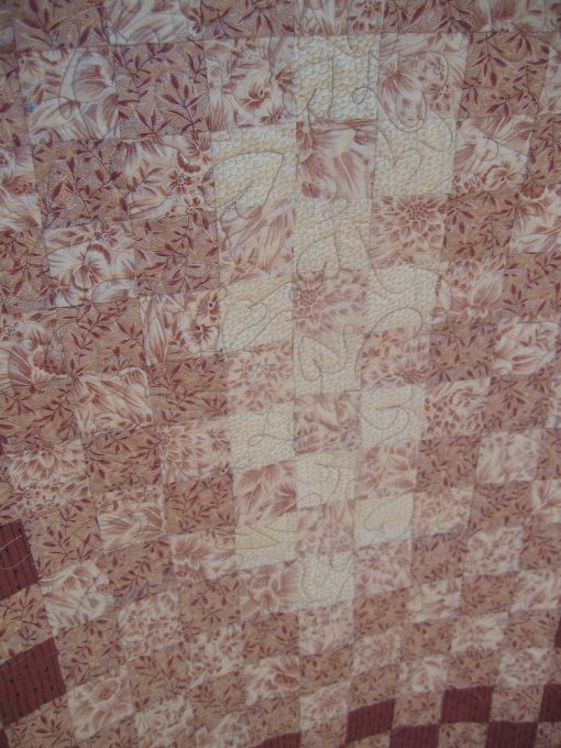 I knew I wanted to quilt it with an all-over motif and in a thread that would not detract from the beautiful fabrics. My friend Bobbie had *just* the thread — ‘Driftwood’ from Fil-Tec (Harmony range), which was a variegated thread in soft maroons, creams, tans and with a hint of blue/grey. It was PERFECT for this quilt — the light parts showed well on the dark fabrics and the dark parts showed well on the light fabrics, creating a reverse colour wash effect to the quilt top.