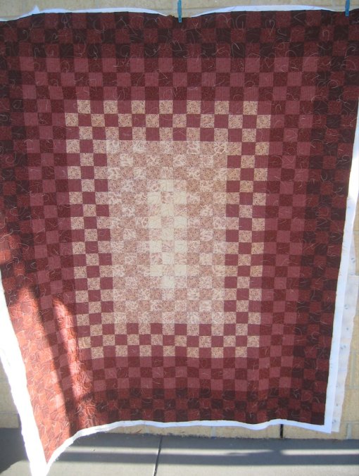 This was the last quilt I had time to quilt at the retreat last weekend (yes, it was a four-day weekend…). And what a beauty it was! The colours, while they aren’t ‘my’ colours, were just gorgeous and the fabrics harmonised so beautifully. This was just a simple 9-patch quilt, but the effect of the colour wash from dark on the outside to light in the centre is just stunning.