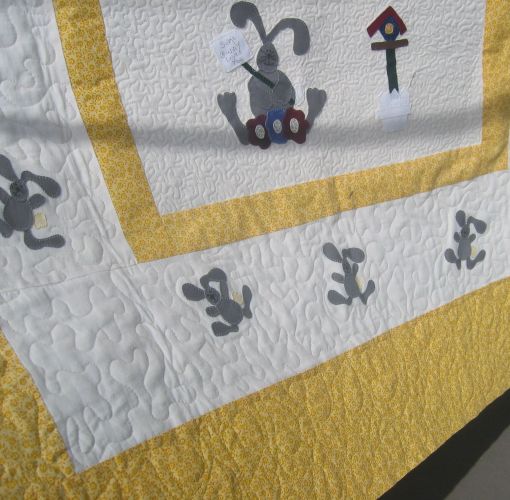 The last of the four quilts I quilted this weekend was another appliqued quilt, this time with a theme of angels. Like the bunny quilt, this one had panels where the applique was the most important element, and I wanted to make these appliqued angels ‘pop’. But I was a bit over stippling! So this time I decided to do some McTavishing. If I thought small stippling took a long time, then McTavishing blew that out of the park — it takes MUCH longer. I think it probably took about six or more hours to quilt this quilt.