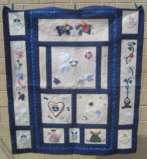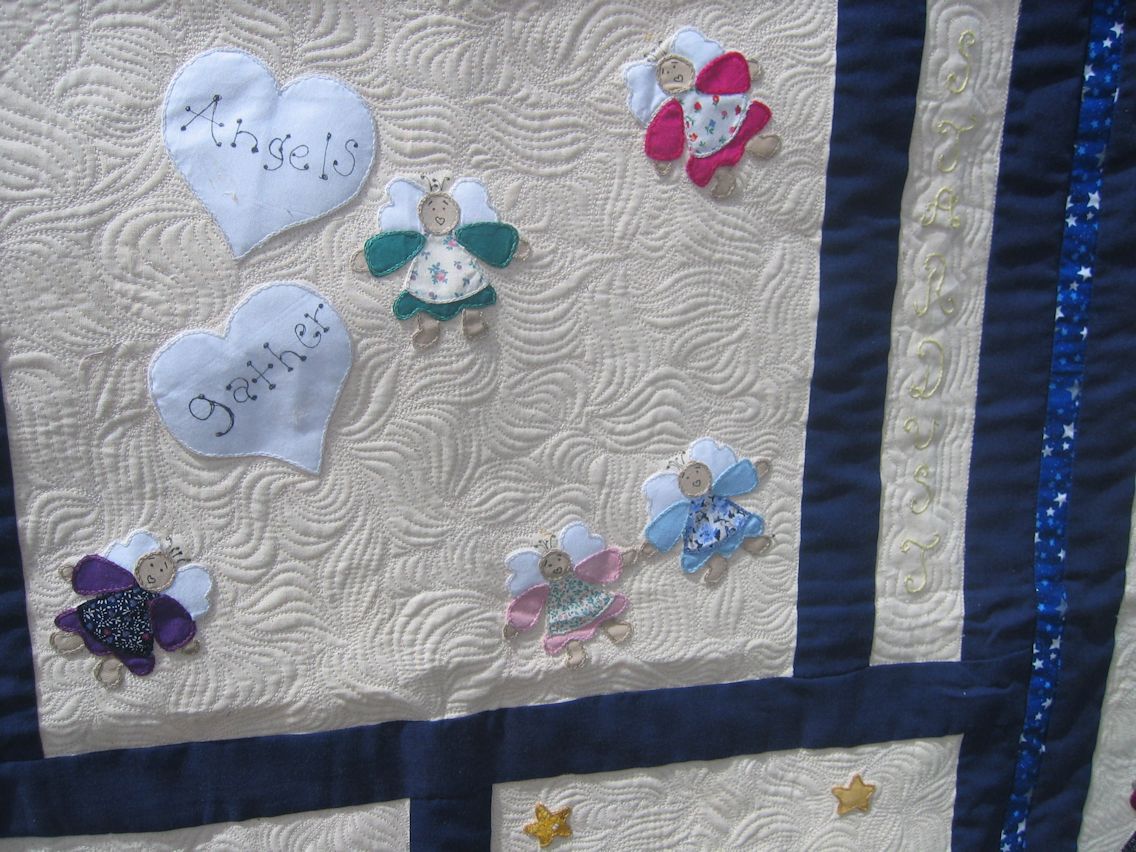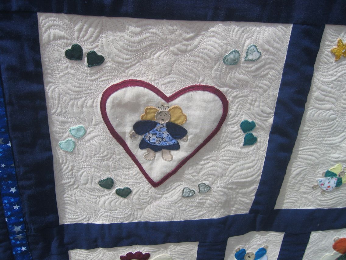 The last of the four quilts I quilted this weekend was another appliqued quilt, this time with a theme of angels. Like the bunny quilt, this one had panels where the applique was the most important element, and I wanted to make these appliqued angels ‘pop’. But I was a bit over stippling! So this time I decided to do some McTavishing. If I thought small stippling took a long time, then McTavishing blew that out of the park — it takes MUCH longer. I think it probably took about six or more hours to quilt this quilt.