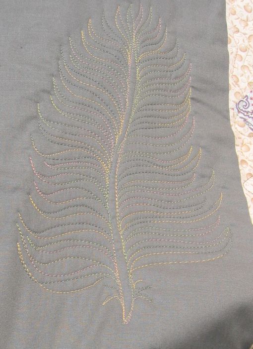 I used the same thread set-up as that for quilt #29. As with that quilt, the thread blended beautifully with all the colours in the quilt and in the brown borders. I like the effect the variegated thread has on the feathers. (I like the rhythm of these feathers so much that I was motoring along at 70% speed when I was doing them 😉