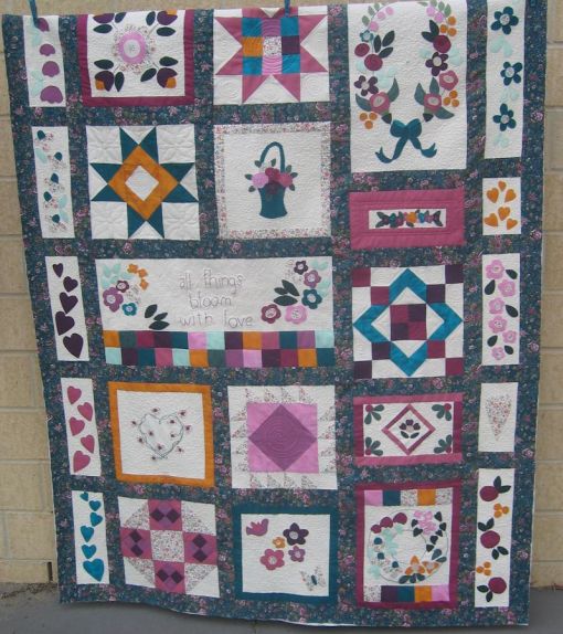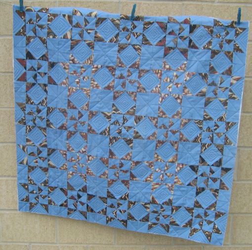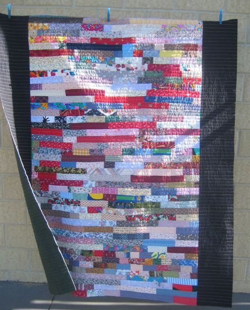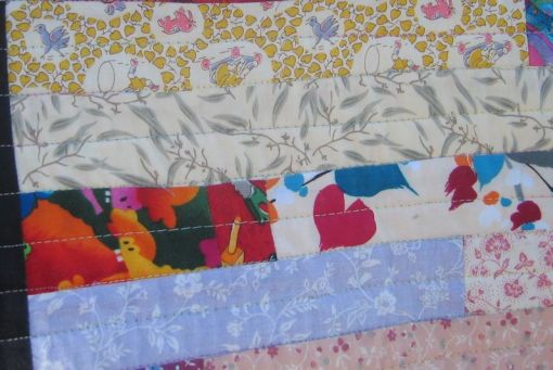 And there was no order to how these strips were put together — lights were with other lights, or mediums, or darks…; colours were placed at random; and fabric styles were also random. Viewed as a whole, this quilt is actually quite nice, but up close it didn’t do much for me 😉