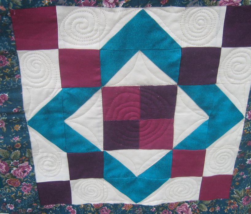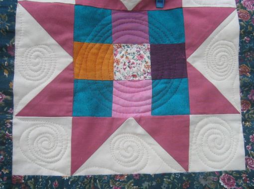 The effect I was looking for was a ‘modern quilt‘ look. Many ‘modern quilts’ that I’ve seen in magazines and on the internet use a lot of parallel straight stitching and very geometric squares, rectangles, etc. — I thought parallel stitching it would be an interesting effect with these old fabrics.
