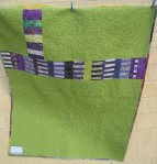 I ended up with some offcuts that I sewed together into bands and used to help create a large piece of backing fabric. The green Jinny Beyer fabric I had wasn’t enough for the full backing and it was only 44″ wide, so I had to sew it together anyway. Adding the bands of offcuts hides the fact that I didn’t have enough fabric 😉 and adds visual interest to the back.