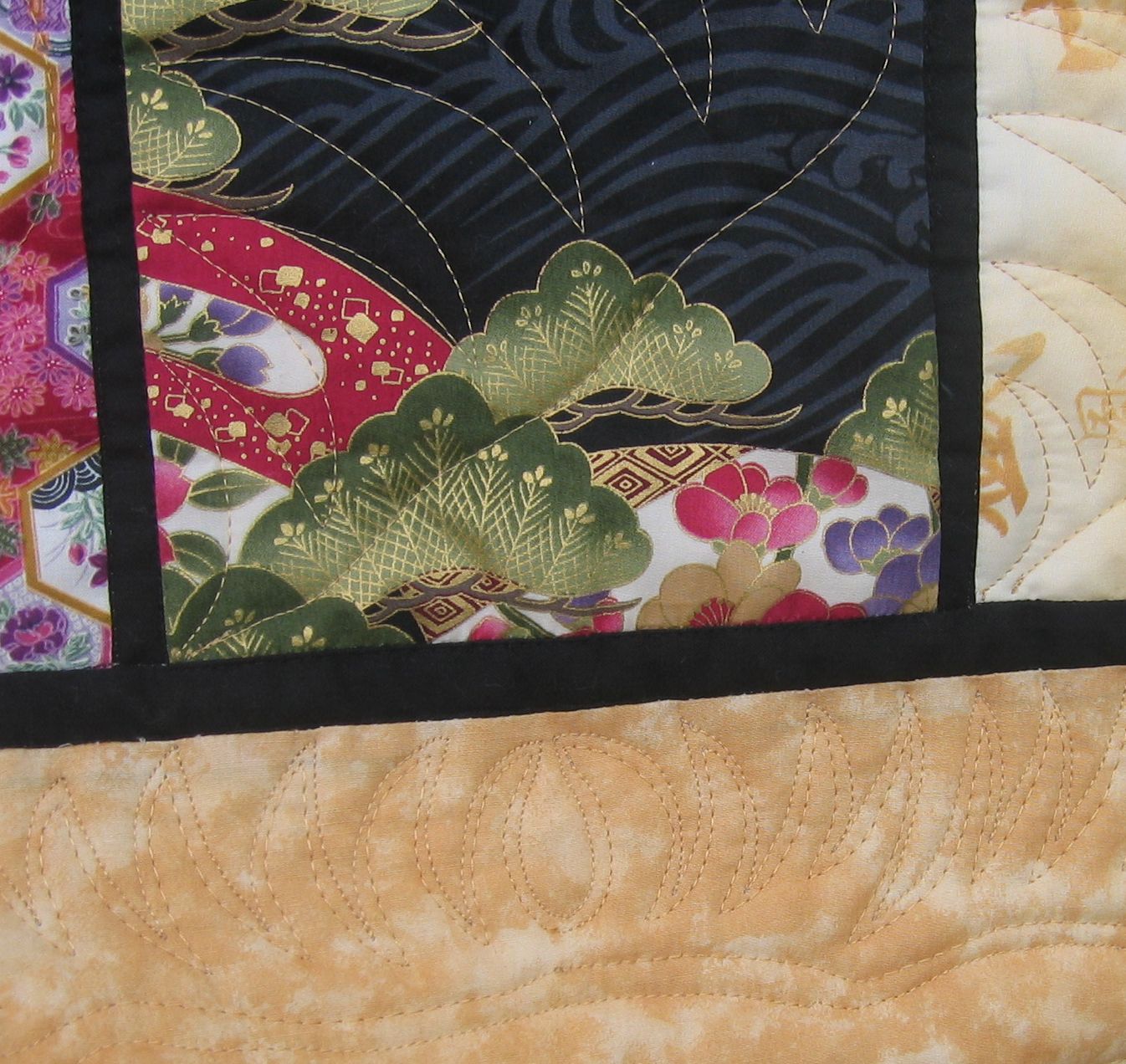 First was a pretty teddy bear quilt. I wanted to make the hand-embroidered bears ‘pop’ (those blocks had double batting behind them, like trapunto), so I knew that tight/dense stitching around the bears would do that. I also stitched around the main bear shapes to make them pop even more. The bears were the most important element, so I used a cotton thread that blended in with the cream (calico?) background. And I decided to use MacTavishing as the tight stitch.