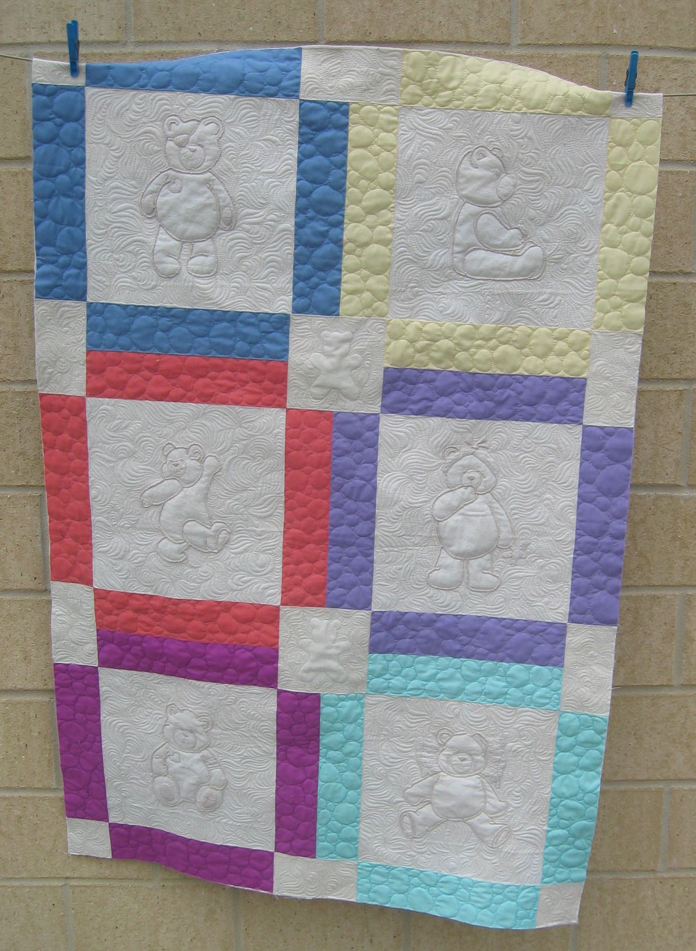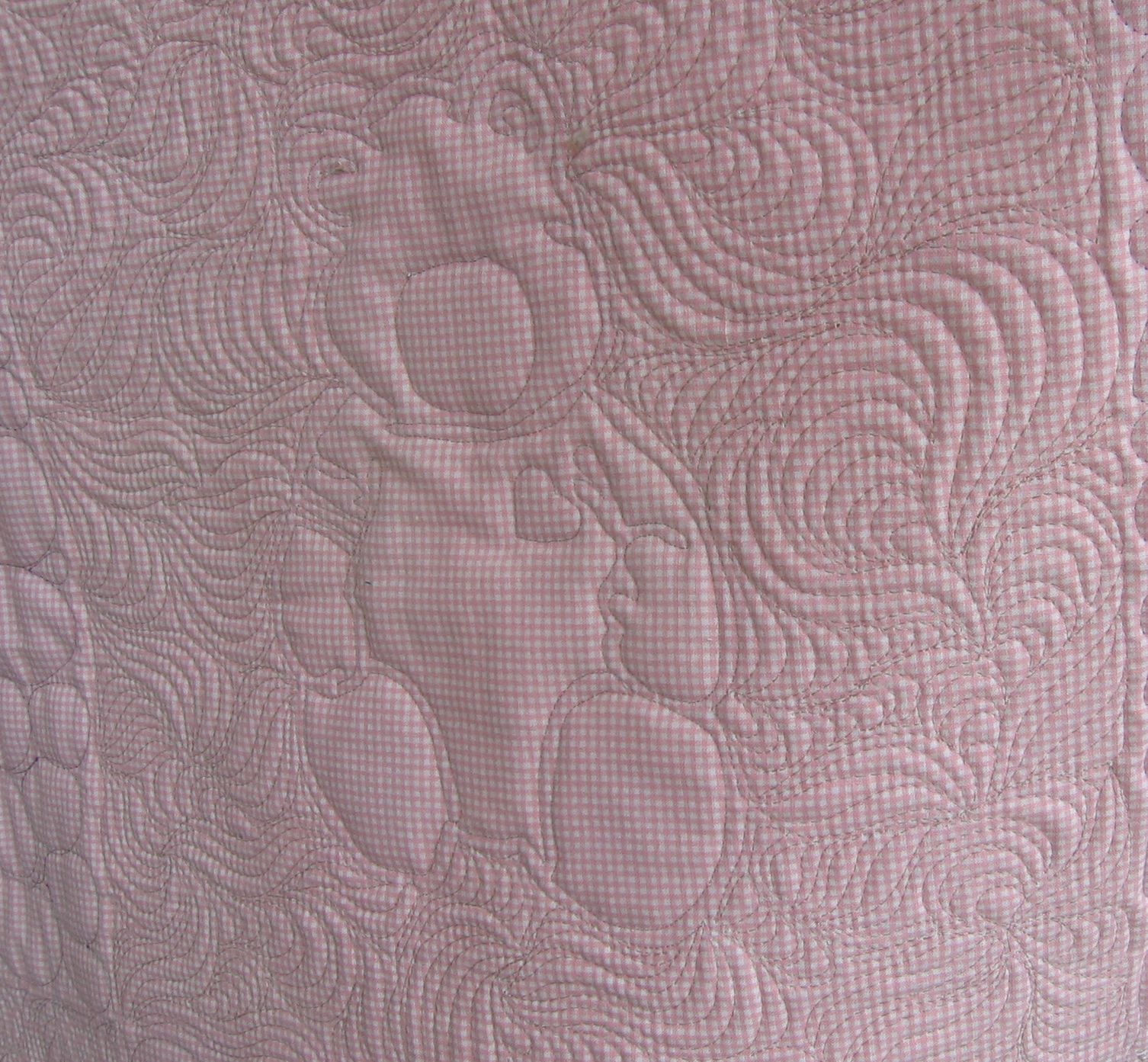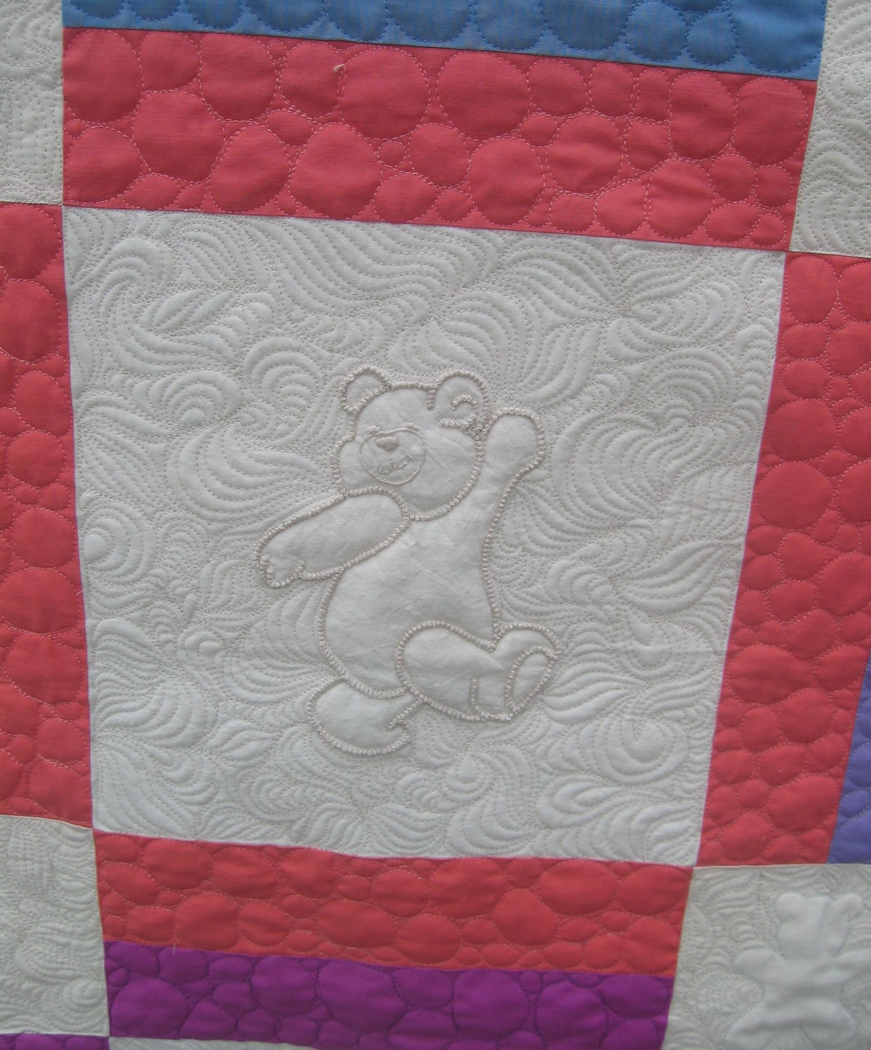 First was a pretty teddy bear quilt. I wanted to make the hand-embroidered bears ‘pop’ (those blocks had double batting behind them, like trapunto), so I knew that tight/dense stitching around the bears would do that. I also stitched around the main bear shapes to make them pop even more. The bears were the most important element, so I used a cotton thread that blended in with the cream (calico?) background. And I decided to use MacTavishing as the tight stitch.