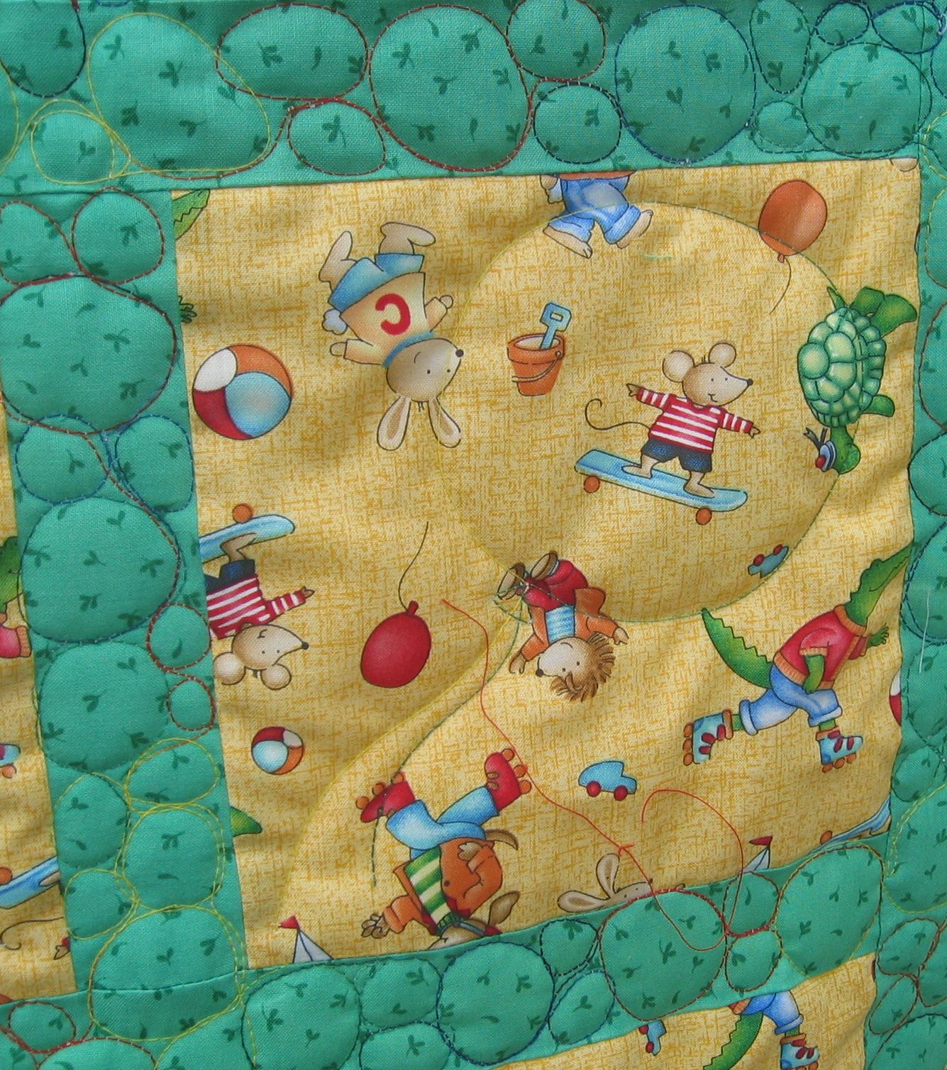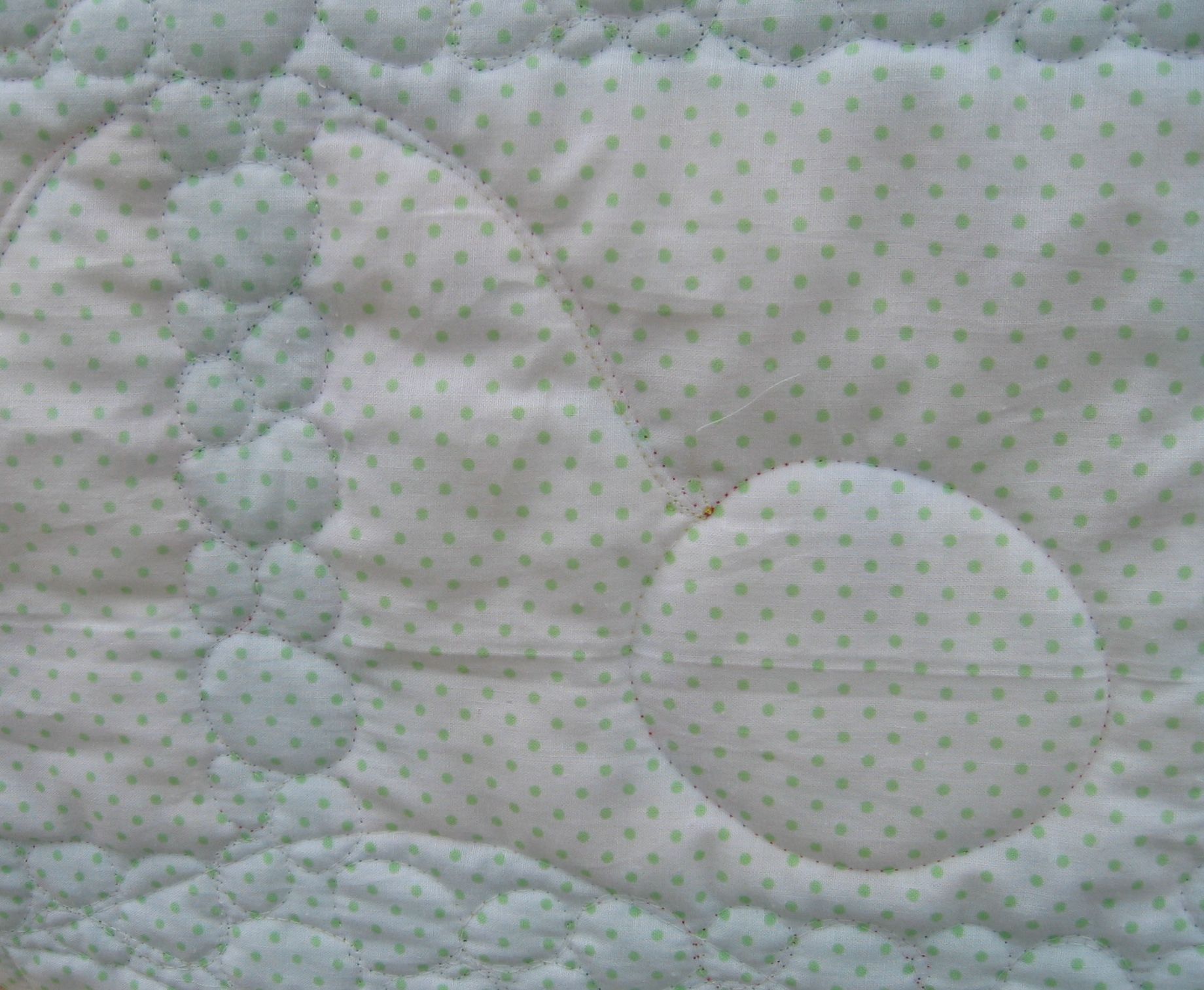 The fabric also had balls in it, so I did large bubbles in the green borders and sashing emulating the roundness of the balls, again, in the same overlocker thread. Then I stitched one HUGE balloon over the entire quilt in the last of my ‘glow in the dark’ thread. Hopefully, the child who receives this quilt will see it at night π