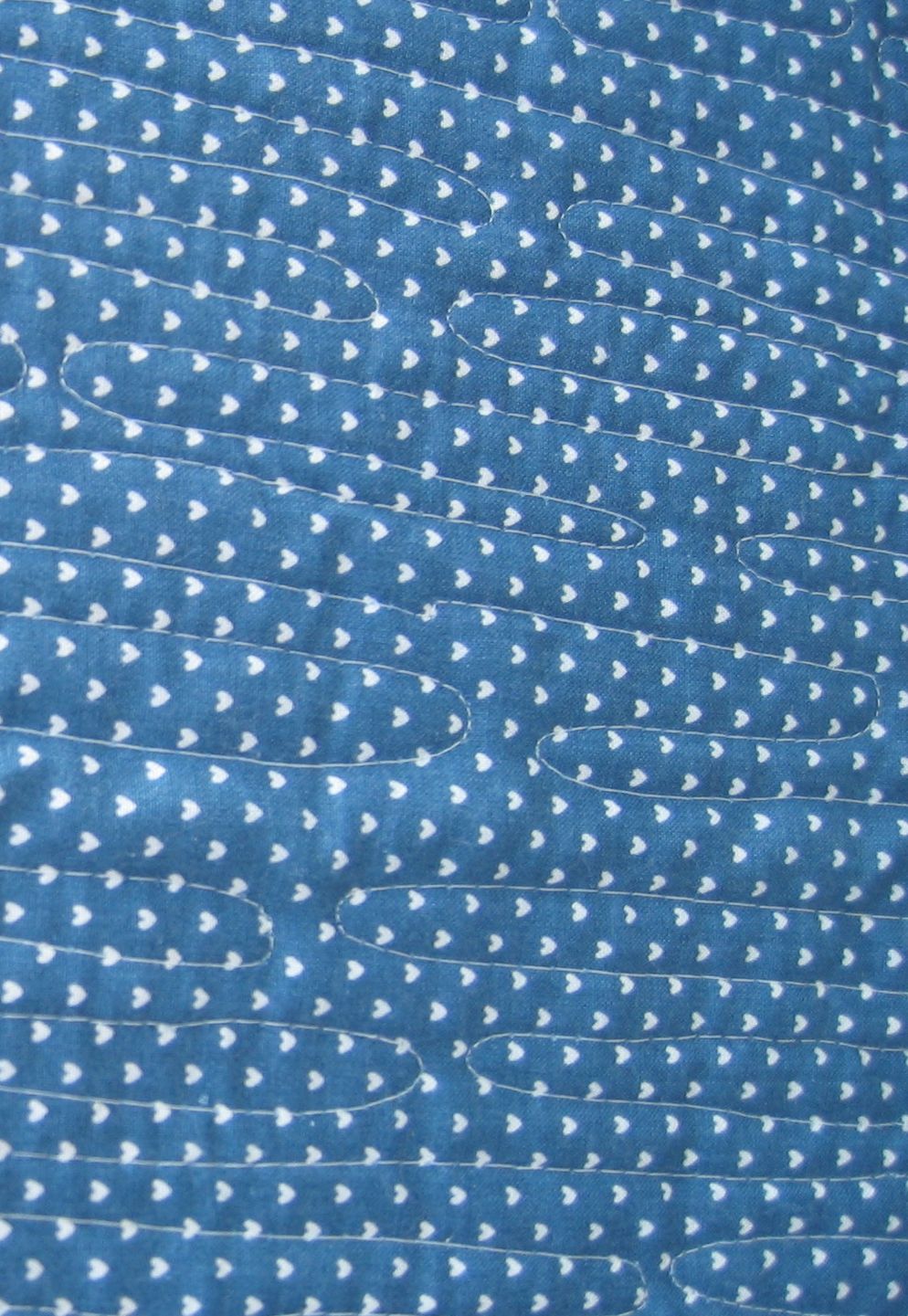 Some of the fabrics had water, fish, water lilies, or water birds in them, so instead of following any of the very geometric shapes of the pinwheels, I went for something quite different — water! I used a pretty pale blue to mid blue variegated thread and I think it worked well for this all-over design. I like how it gives a ‘modern quilt’ feel to this traditional pinwheel pattern.