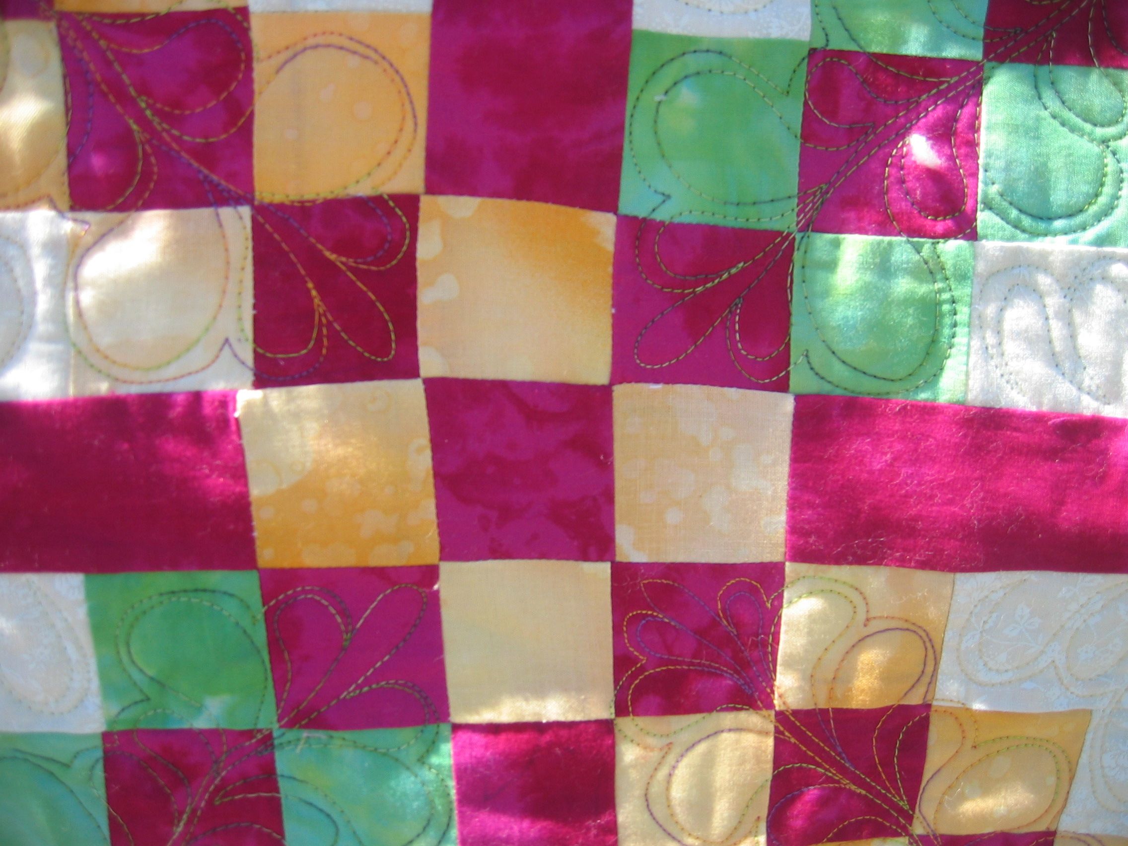 But how to quilt it? The easy option would’ve been stitch in the ditch. Instead, I decided to do feathers in the checkerboard ‘arms’ of each block, in variegated threads that matched the block’s colours.
