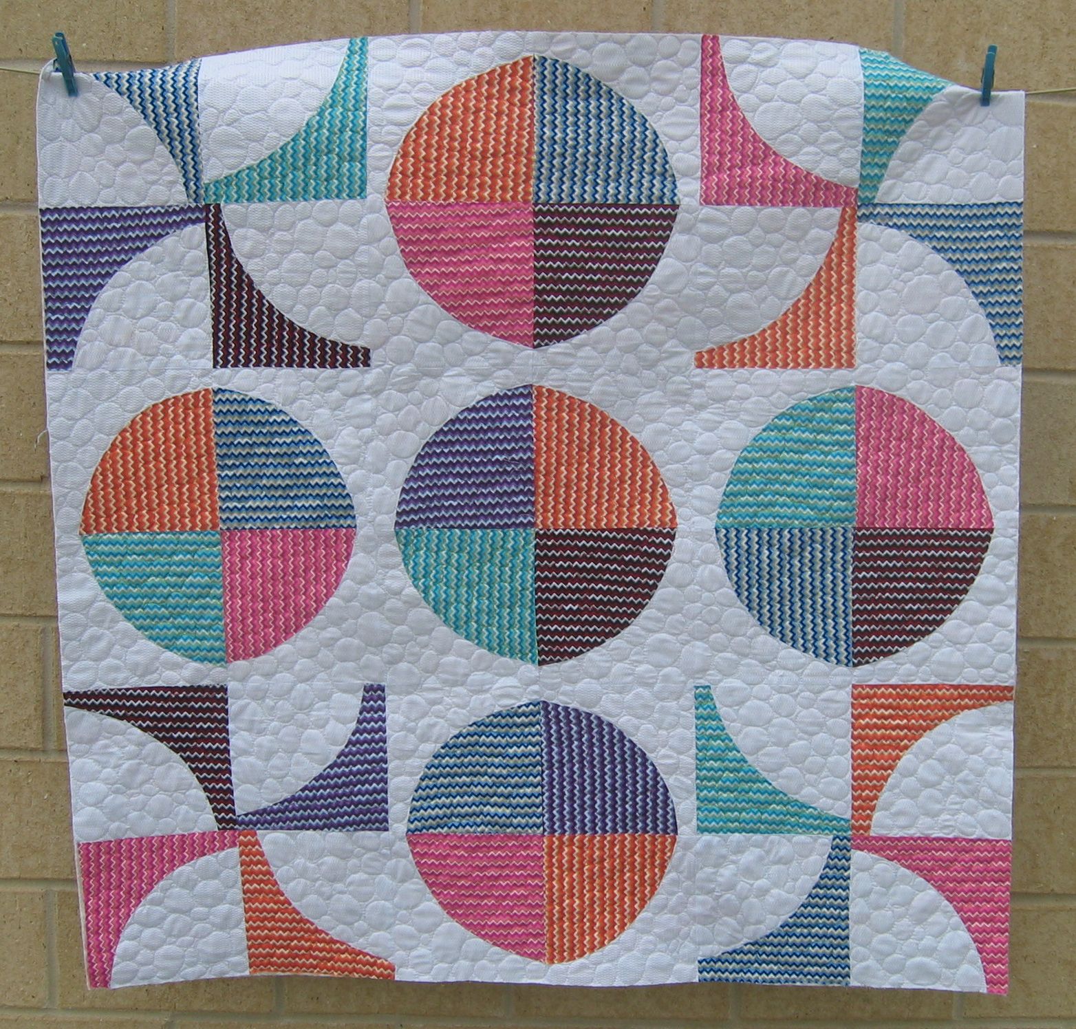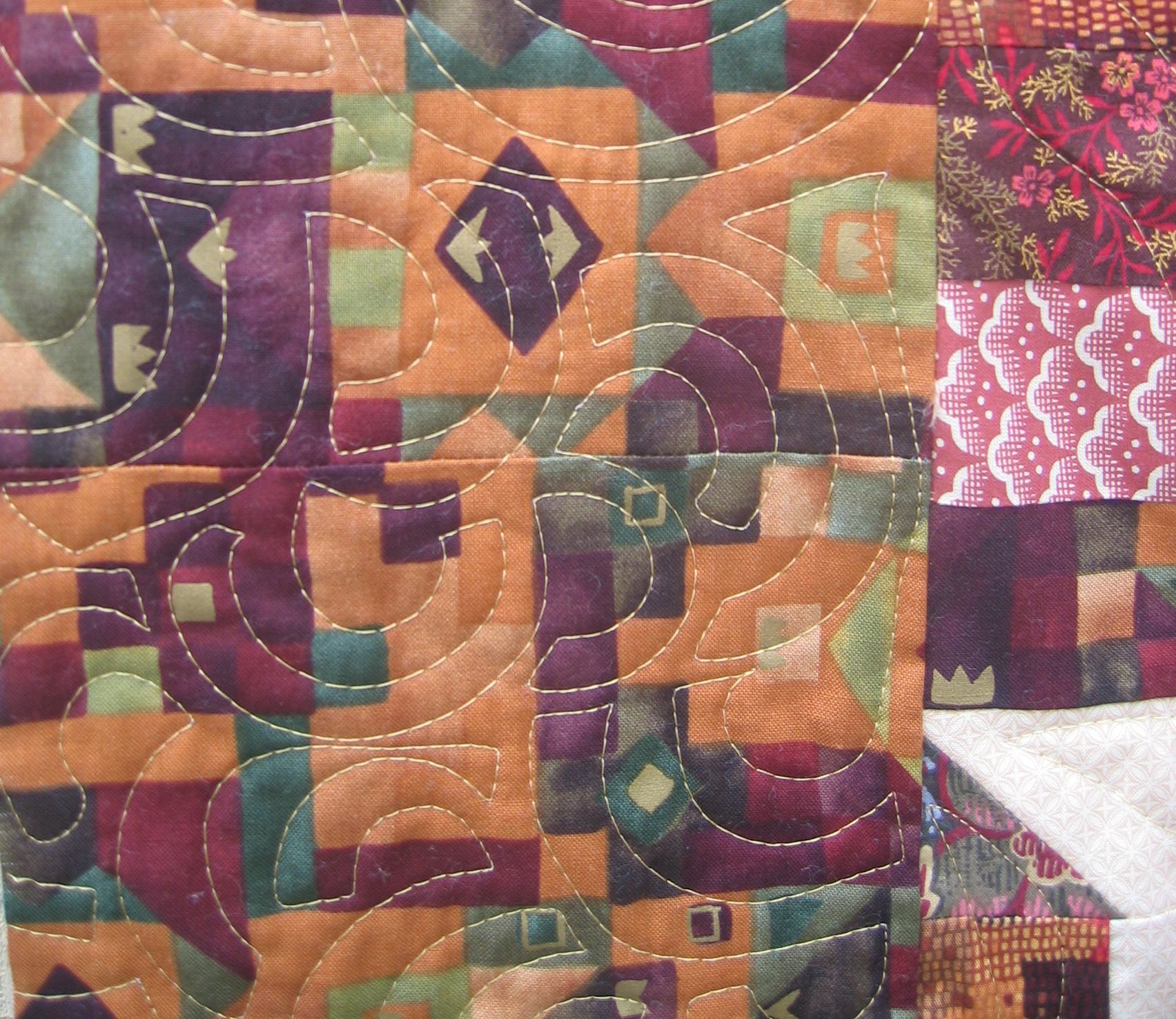 The design reminded me of some native American art I’ve seen in places like Arizona and New Mexico. I had to let this quilt sit for a while, while I decided how to quilt it. Then I remembered that I’d downloaded an image of a free motion quilt design some time back of a Navajo sun — that would fit perfectly! In essence the sun design is a spiral in the centre, radiating out into freeform arms.