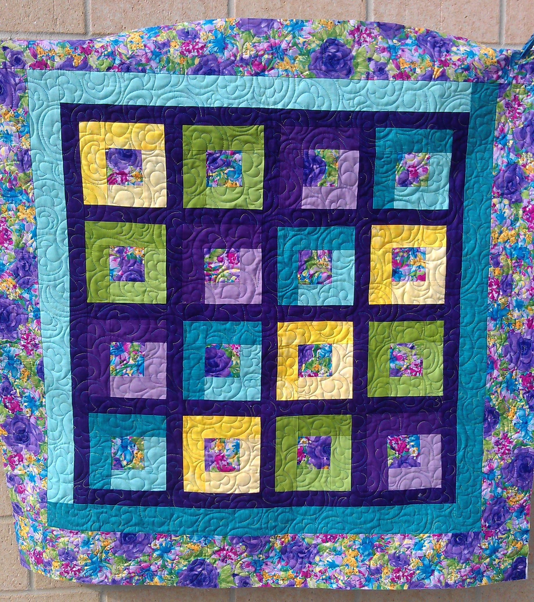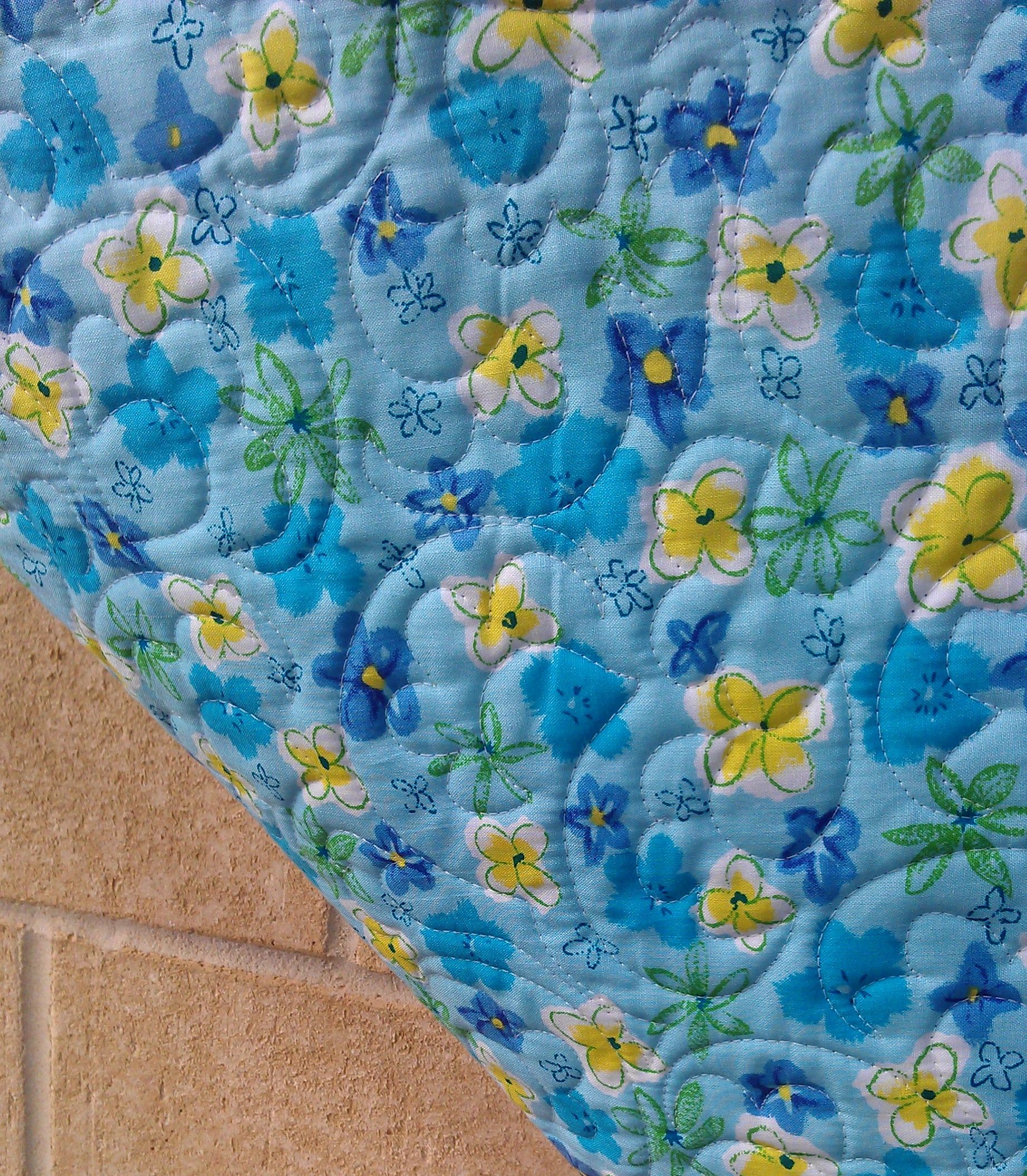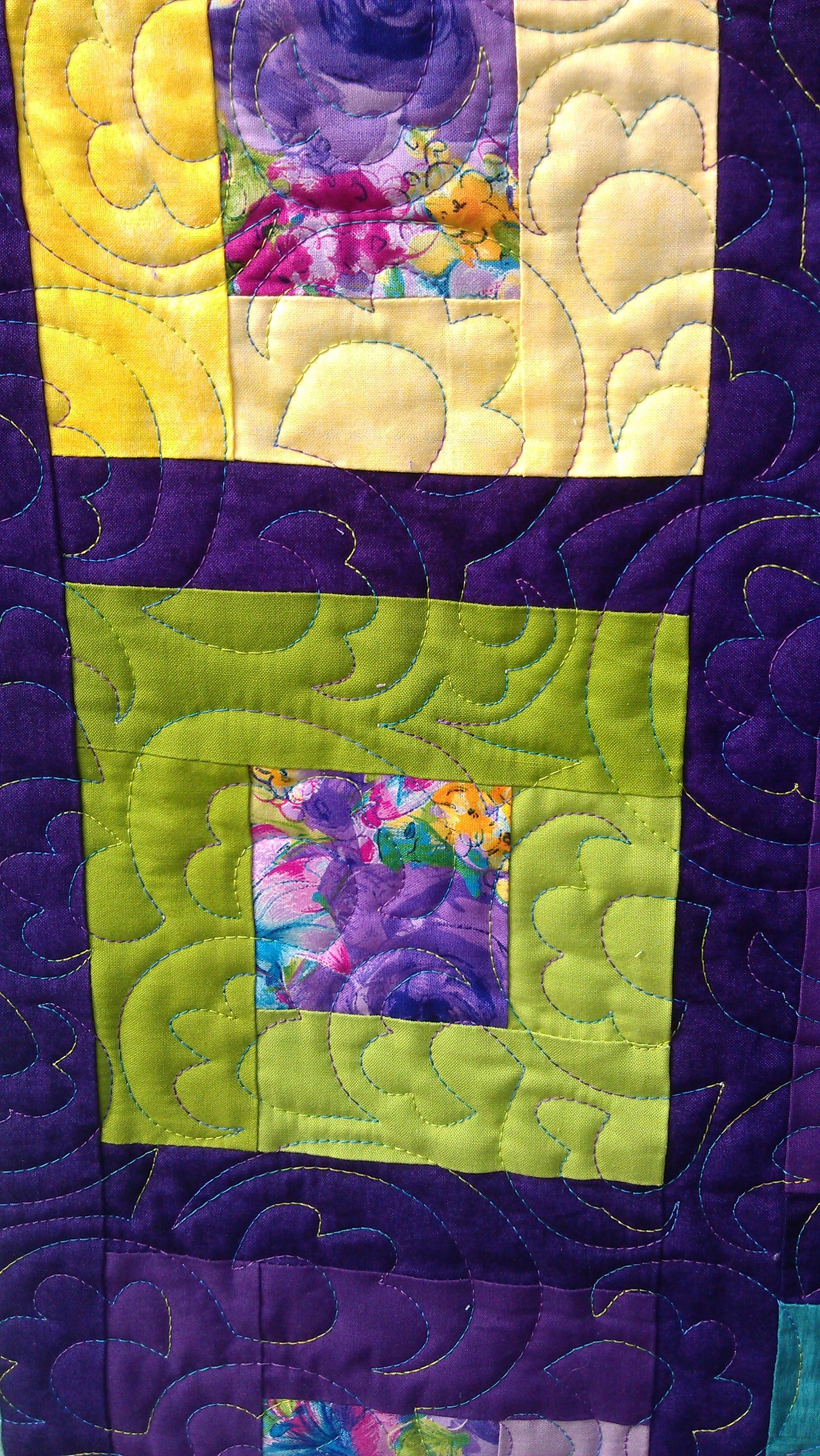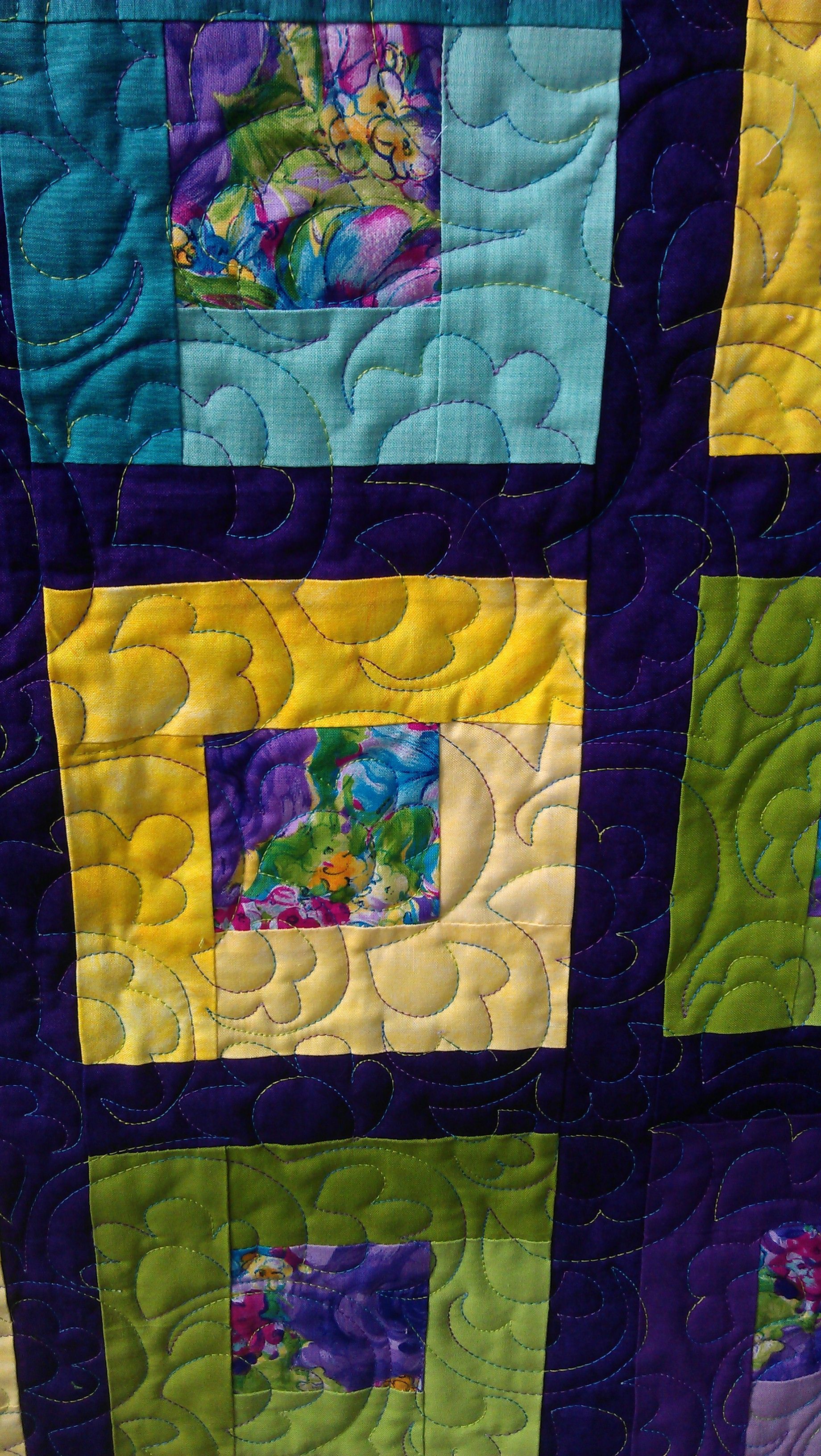 I love this quilt! The bright coordinating colours were just ‘me’. And I had the perfect thread for it too — King Tut ‘Passion Fruit’ — a blend of yellow, purple, and green. The quilt needed to shine, so I just decided to do an all-over funky, floral open headband variation in keeping with the floral fabric in the border and the centres. (This quilt was perfectly square too, so many thanks to the maker.)