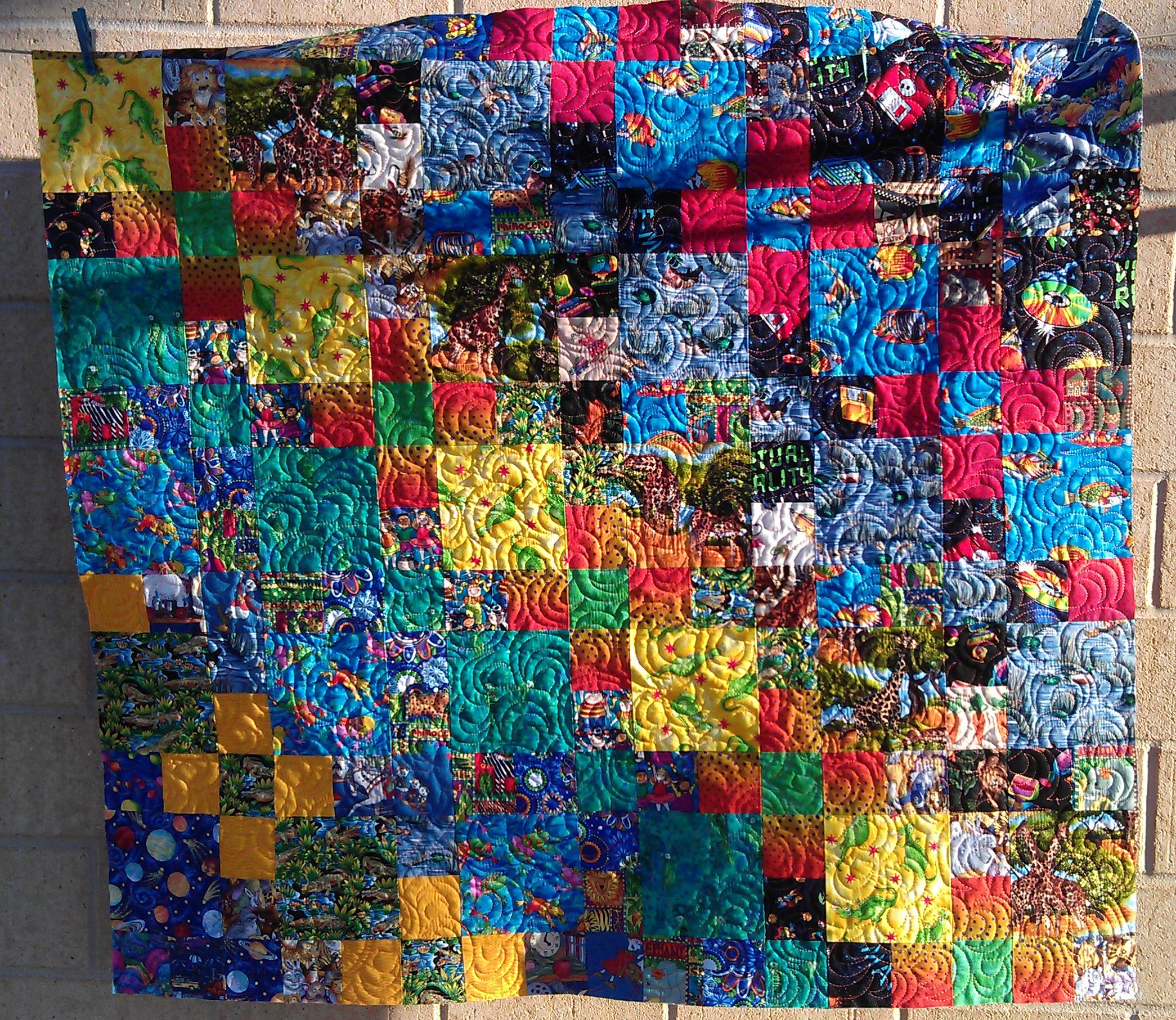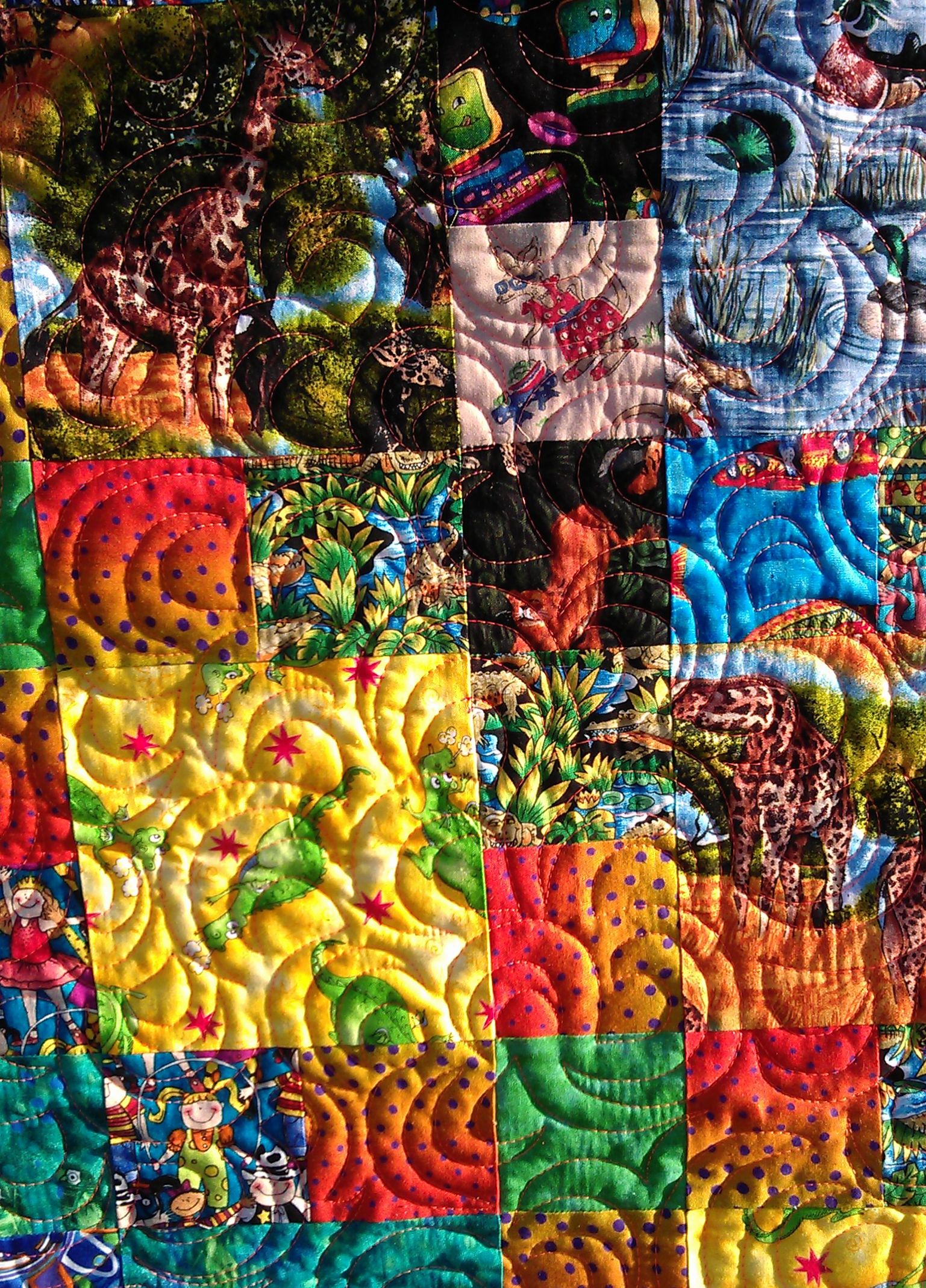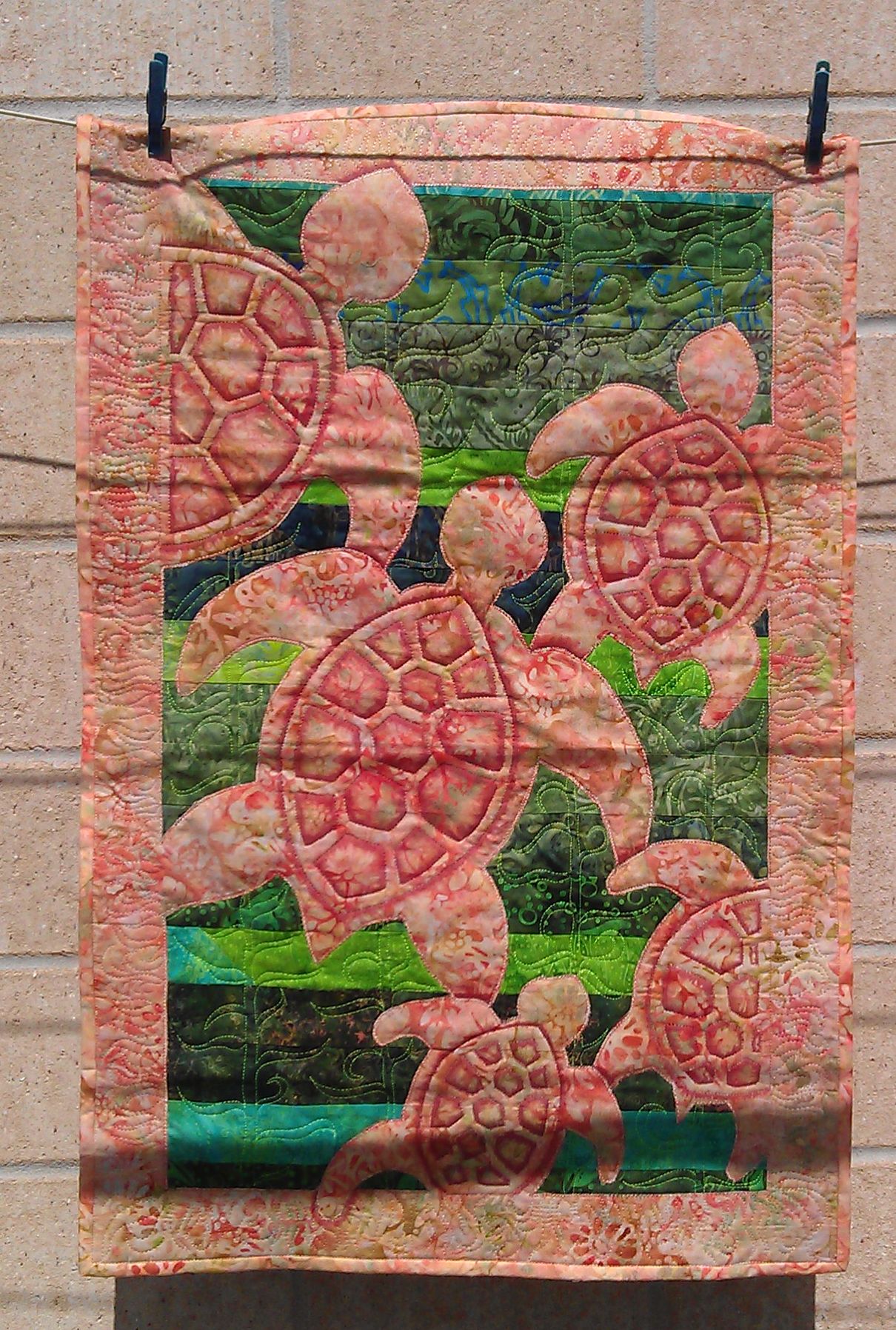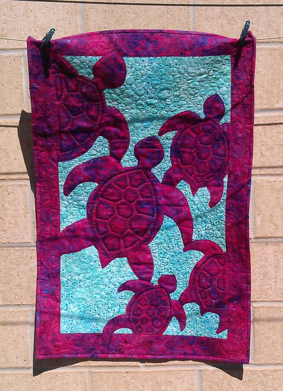 I wanted to try another turtle quilt using the Herd of Turtles pattern (available from here: https://www.pacificrimquilt.com/2faq/), but this time using the raw edge applique technique. This method was much quicker for me, and I saved even more time (and a lot of anguish!) by NOT cutting out the areas around the sections on the carapace. Instead, I got out the Copic markers I’d purchased when I was in the US, and shaded the carapace sections to give the illusion of dimension. I was quite pleased with how the shading turned out. I had the green jelly roll fabric I’d made up a few weeks ago and that I didn’t particularly like, so I used that as the background, and for the turtles I used one of the metre-long batik lengths I’d bought in Bali last September. Because this is raw edge applique and because this is a quilt likely to be hung in a child’s room or used for a child, I wanted to stitch down those raw edges a bit more securely, so I used the same thread I’d used for the raw edge and stitched those edges down using a blanket stitch. Finally, I added some wavy kelp using a fluoro lime green thread, then followed the waviness of the kelp into the border.