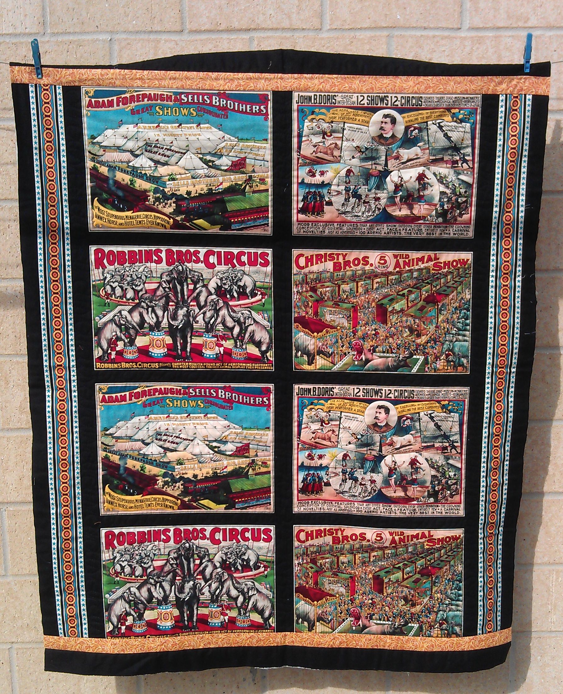 A few of the quilts I get to quilt for the Community Quilts program are just weird, in my opinion — this one falls into that category. I have no idea what inspired Windham Fabrics to make this circus panel from the 19th century/early 20th century, or what inspired someone to buy it, or what/who inspired them to make a quilt with eight panels rolled straight off the bolt of this strange fabric!