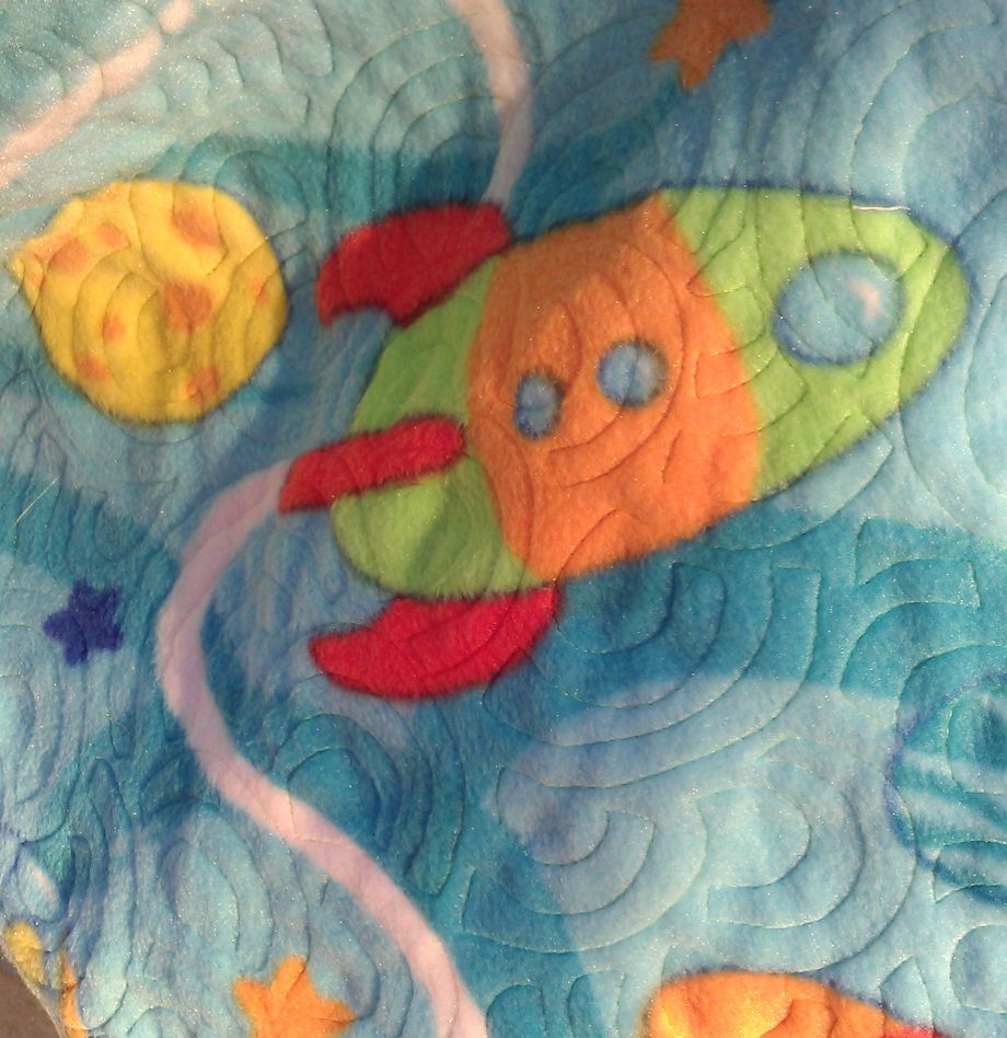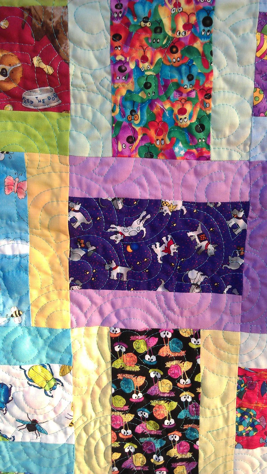 As the quilt fabrics were so busy, I just did an all-over squared off ‘open headband’ motif. However, I had a great deal of difficulty in keeping this quilt from puckering. My tension was fine — the problem was that the quilt wasn’t a quilt sandwich with proper batting inside it. The quilt top had been laid directly onto the backing fabric, which was a polar fleece. It was as a slippery as anything on my quilting machine table, and it puckered as I stitched.