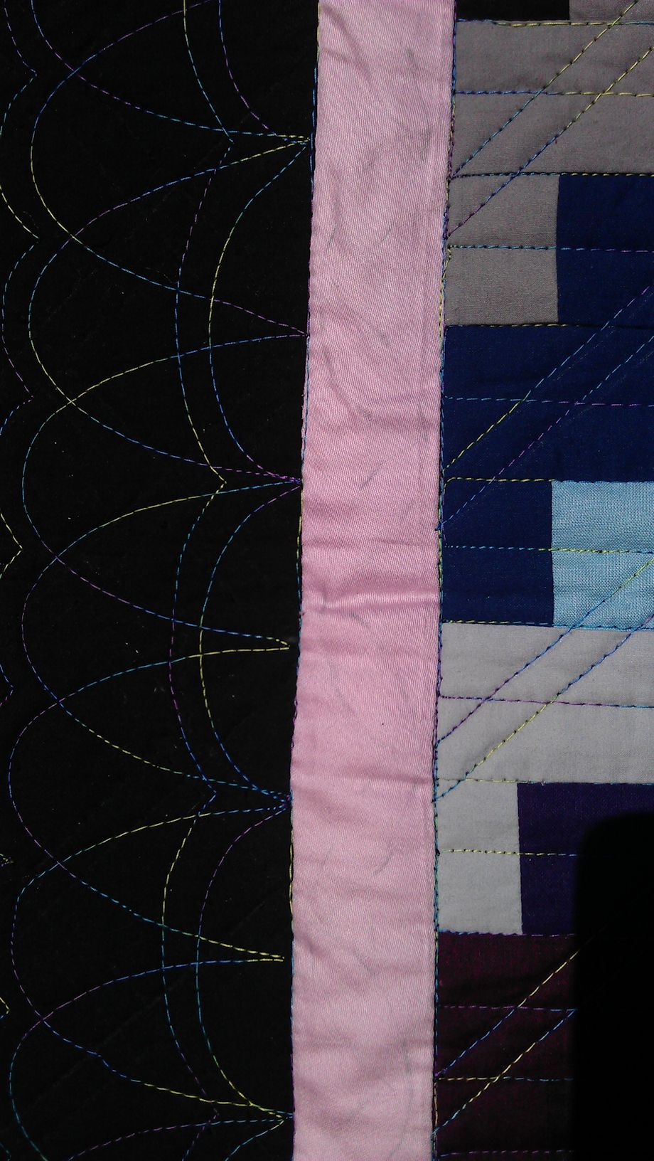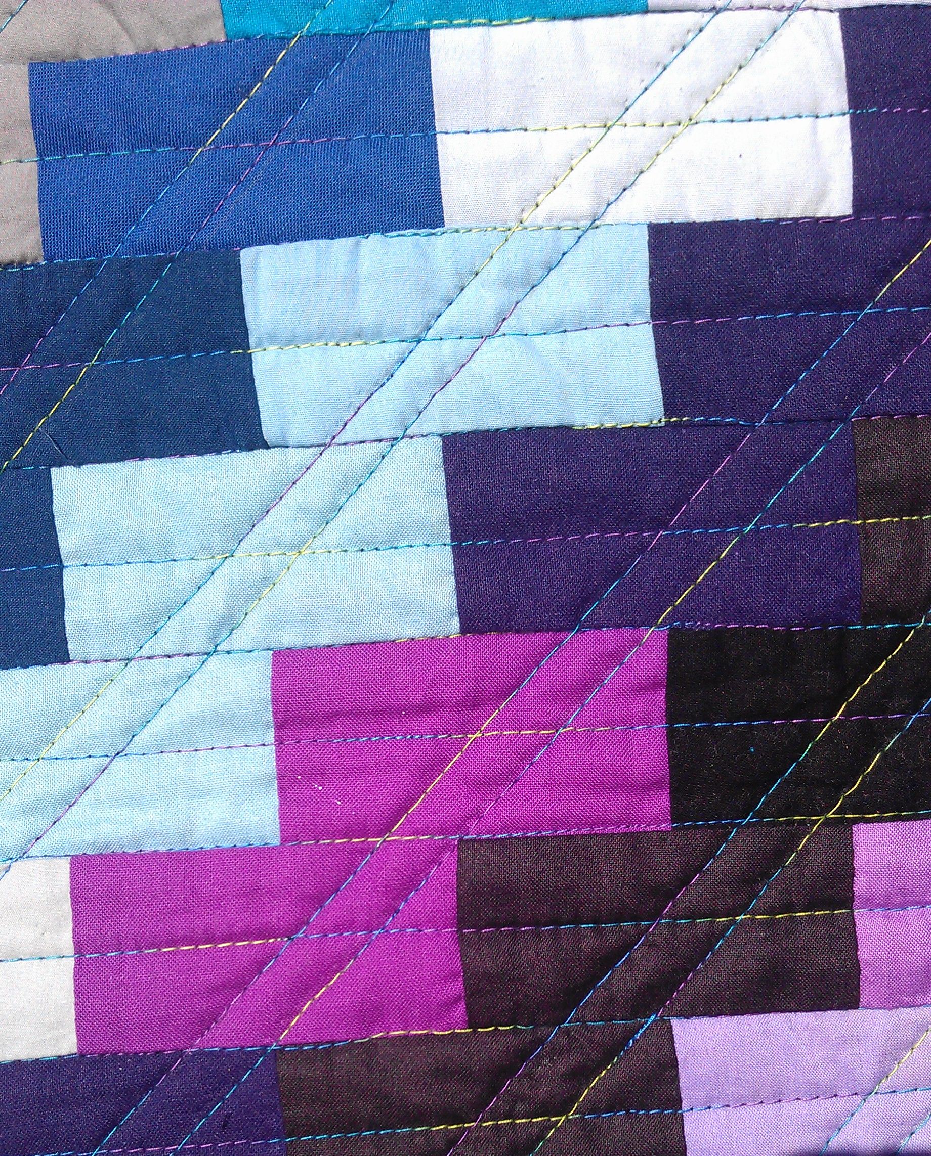 This little quilt (yes, it was quite small compared to some others I’ve done) took an age to quilt. why? Well, I started by quilting the diagonal lines, then when I’d nearly finished them, I realised that something wasn’t quite right with the bobbin tension and so I unpicked all those lines. Once I got the tension sorted, I decided instead to quilt the straight horizontal lines, but once that was finished, those diagonals still stood out (they were marked and I’d stitched over them, so there were marks and needle punch holes), so I redid the diagonals. I quite like the effect once I’d finished.