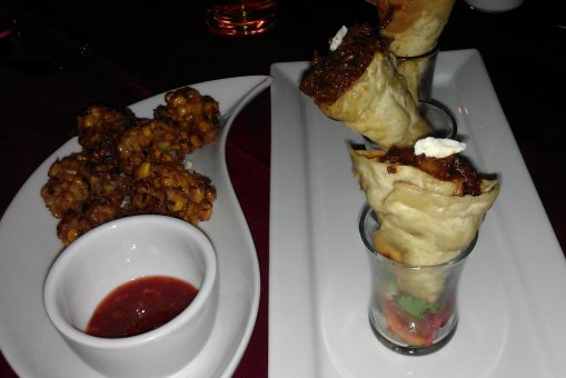 Spicy crispy corn balls and beef rendang cones