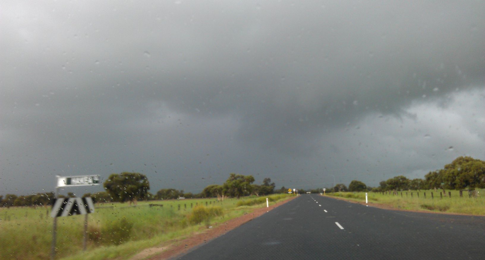 Here’s a photo from the car of the weather up ahead (I was north of Dardanup at this stage, so it hadn’t hit with a vengeance — yet…):