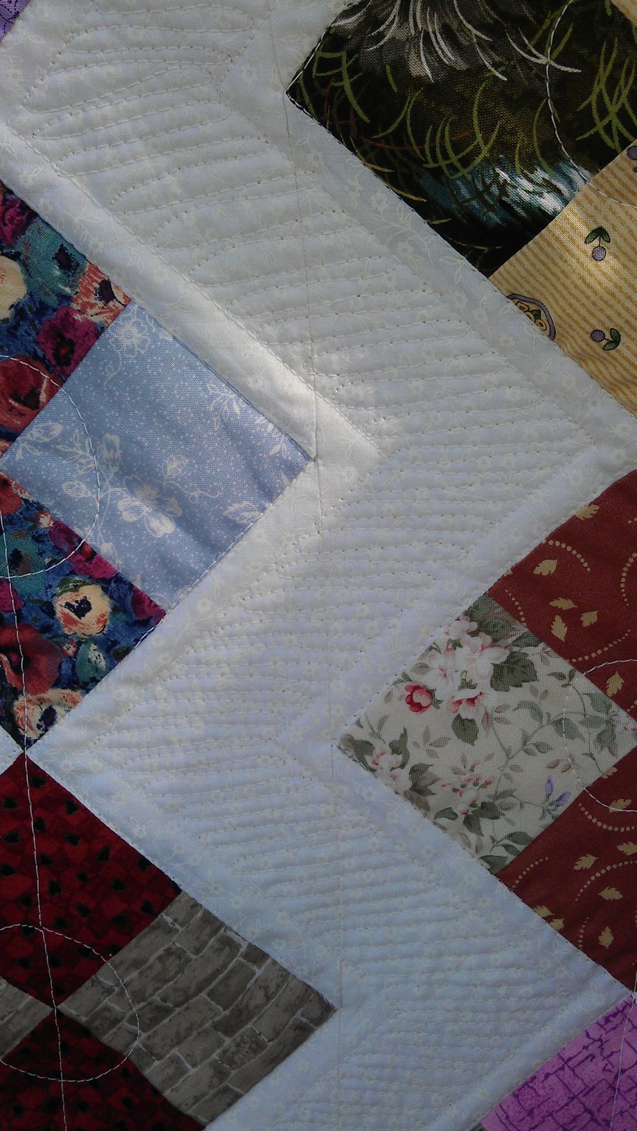 This was a fairly ordinary scrappy quilt (MY opinion only — others may love it), but that white space just screamed out for some chevron-style quilting I’ve seen a lot of recently.