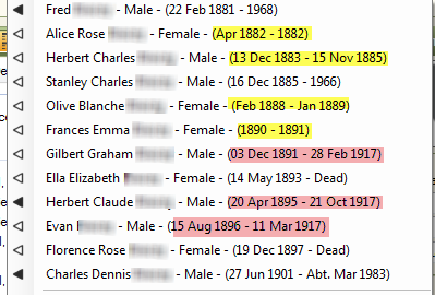 And while doing that I found evidence of tragedy, just in the dates of birth and death recorded in my family tree software.