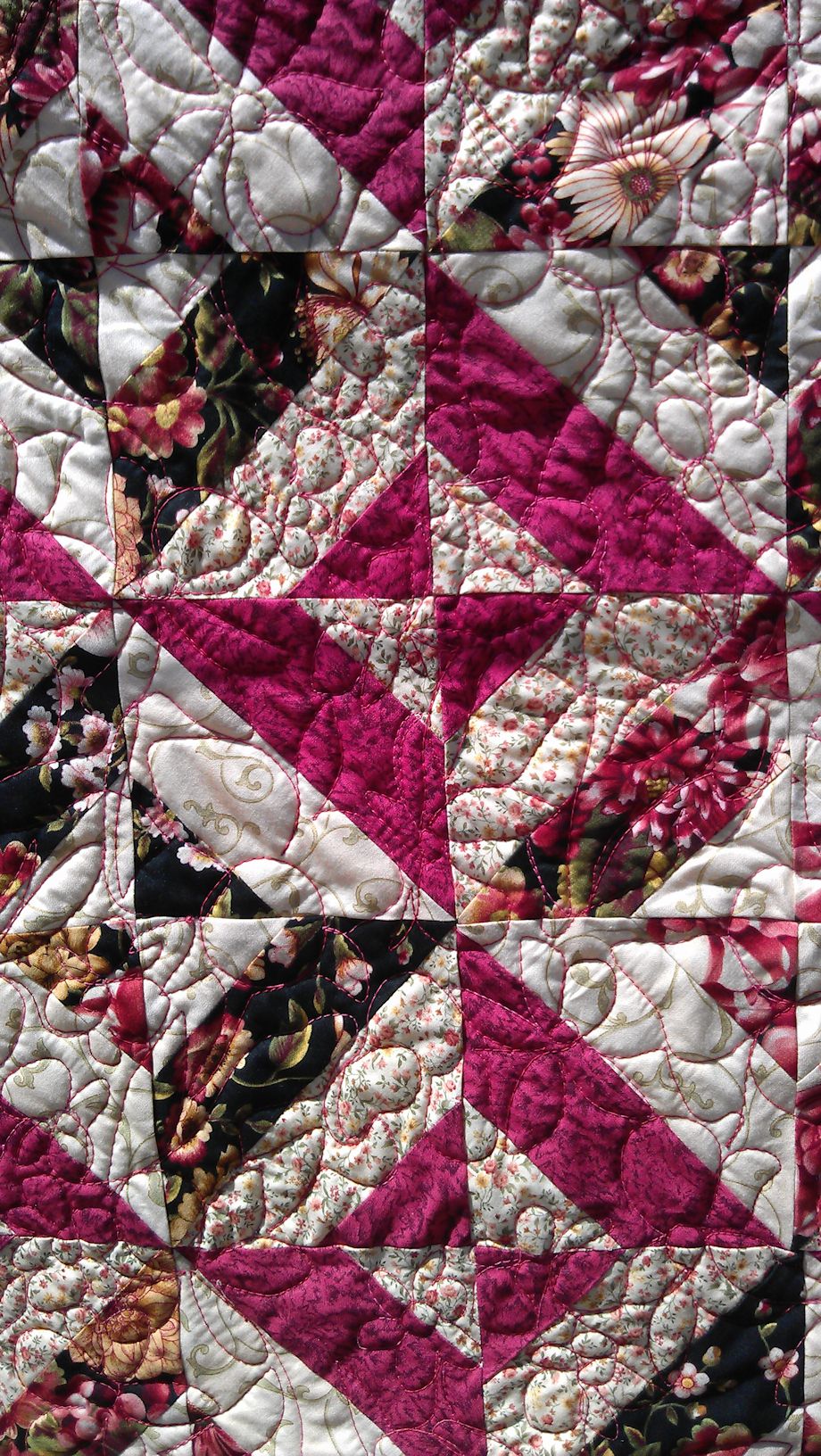 If this quilt looks similar to the others I’ve done recently, that’s ‘cos it is. I was given a batch of quilts that had used the same block designs and sizes, though all were done in different fabrics, thus creating different effects.