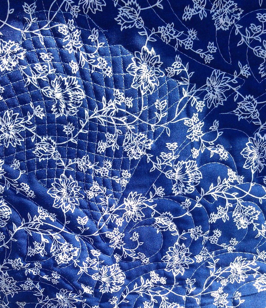 How to quilt it? I decided to start with the centre diamonds, and stitched a wavy matrix/cross-hatch in each. Then I did an open headband motif for the rest of the top, and some small clam shells in the border (using my Handi Quilter 2″ clam shell ruler).