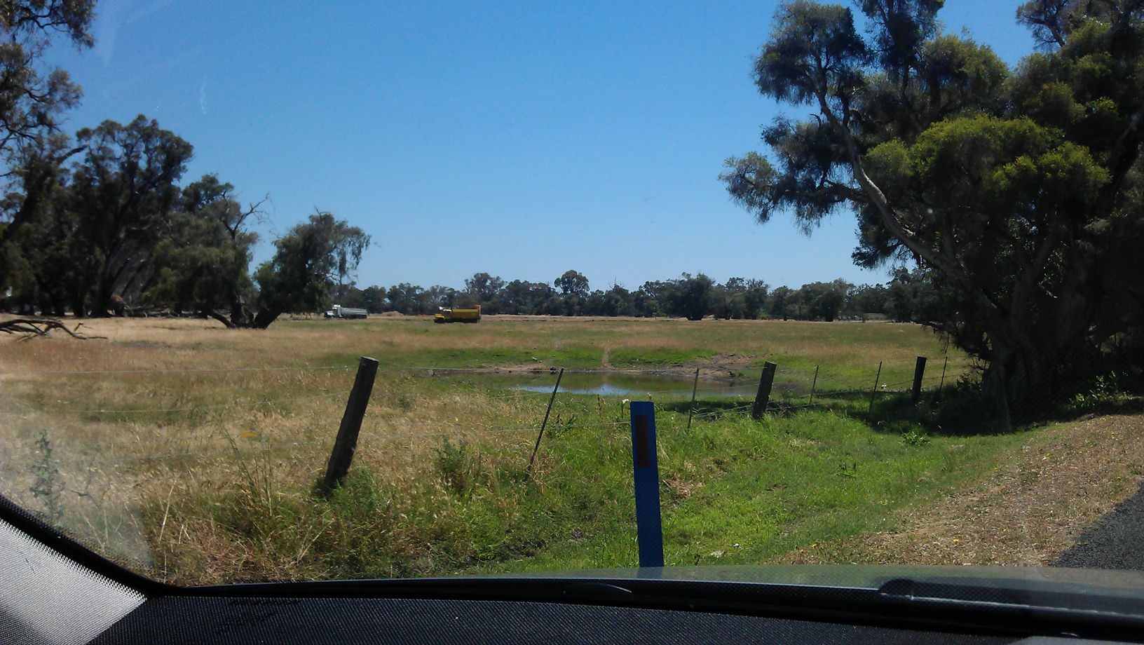 And at the end of last week I found out. On my drive into town, I saw several earthmoving trucks and vehicles on the farmland opposite the newly installed street light, and noticed the cattle were all gone (the horses and the camel went ages ago). A temporary road has been constructed into the farmland and it looks like a new subdivision will be going in there. I checked the local shire’s minutes on their website and found that the land is being divided into six lots, presumably ‘special rural’ lots with small acreage. (Update: I found more info on the application for subdivision on the Shire’s website and each lot will be 5 to 10 hectares — that’s about 12 to 25 acres for those who can’t convert hectares to acres! Further update (Dec 2013): There are five blocks with ‘For Sale’ signs on them, all around 5 hectares, and priced ‘from $690,000’, though I can’t find them listed on the real estate agent’s website yet.