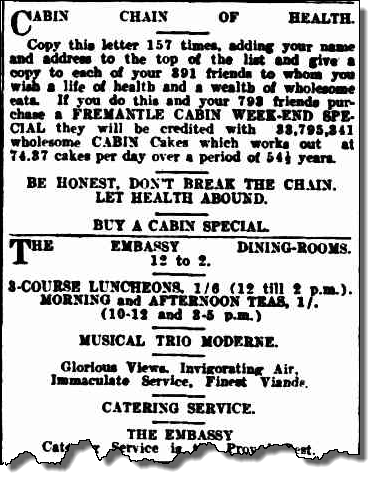 Very strange! Fancy asking someone in 1935 to copy a letter 157 times (that would be BY HAND), then giving that letter to 891 friends (I’m not sure how 157 letters becomes 891… and even you did have 891 friends [or even 157 friends] then no doubt you’d have to mail some of these HANDWRITTEN letters at YOUR cost…) and then 793 of those friends have to purchase these ‘cabin weekends’ so that you get 33 million cakes at 74 cakes a day for 54.5 years! Even using a calculator I couldn’t get that maths to work.