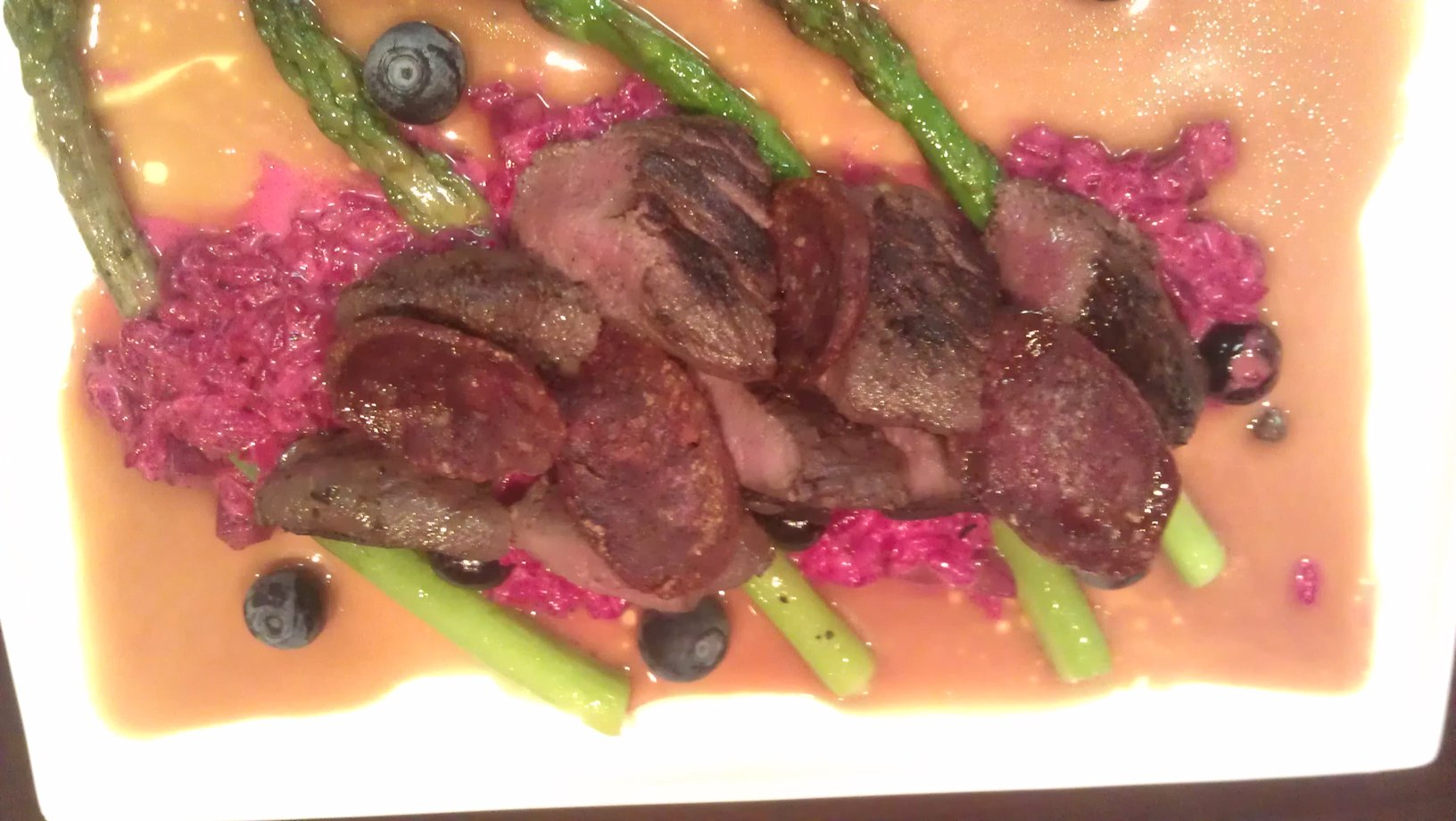 I’d booked us into the motel’s restaurant for dinner (Lime 303) as I had heard good things about it, had read some glowing reviews, and as it had won at least one Gold Plate award. Lime 303 was a real surprise in several ways. The decor indicated 5-star, and the menu was very fancy with an awful lot of stuff and combinations on it I didn’t recognise. We both had the sous vide venison rump, which came on a bed of asparagus spears and a beetroot/blueberry risotto mix. I actually quite liked the dish but my DH hated it – he thought the pink mash looked like mashed brains on CSI! (and looking at the photo I took on my phone [below], I think maybe he had a point…) He’s a steak or chicken person and while he doesn’t mind venison he sure didn’t like the texture of the meat after the sous vide process. He had the cheese plate to finish and I had the trio of sweets. Including the wine and his glass of port the whole meal was $173 for two (!!), and then he wanted to go get a burger or kebab! He’s a man of simple tastes…