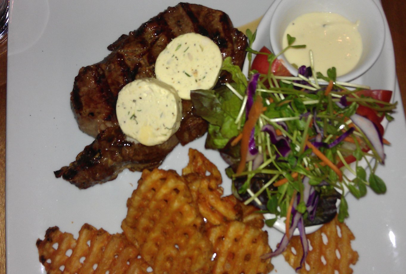 We’ve eaten at Rustlers several times before and it was a great meal as always, but I think I overdid it ;-). We started with a shared serving of six Jalapeno Poppers, followed by our steaks. I had the rib eye (though there was no bone this time) with blue cheese butter. It was a big steak — about 400 grams! My DH had the prime fillet. Both came with a garden salad and fries or baked potato.