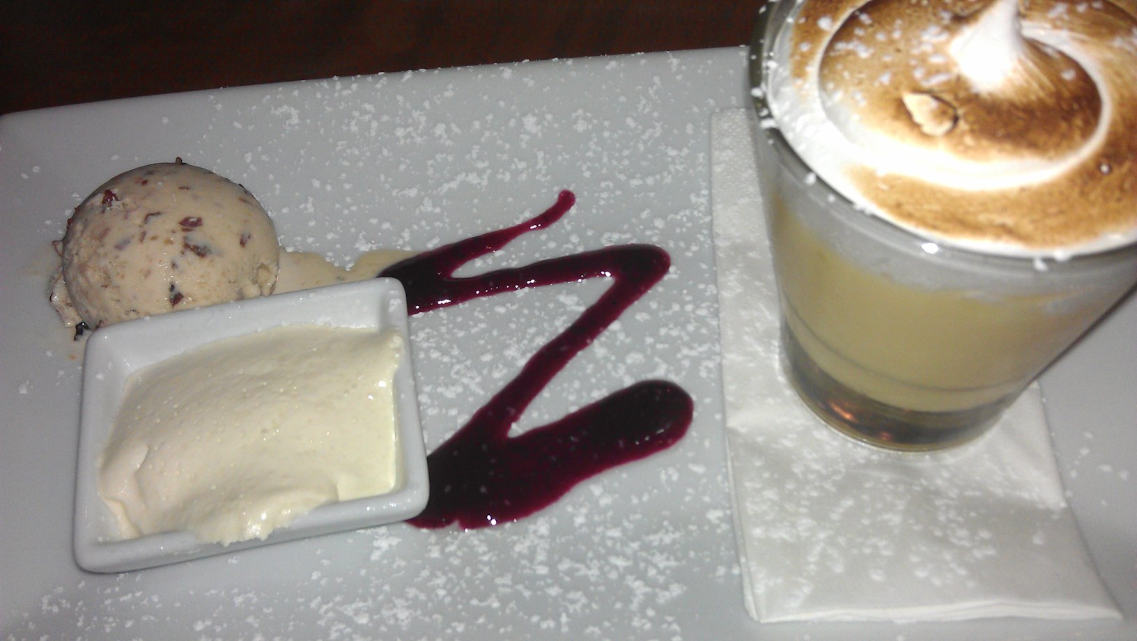 And then my DH ordered TWO desserts for us to share. We rarely have dessert so this was a bit over the top. We had the very tart lemon meringue and the mango and passionfruit tart, both with cream, raspberry coulis and rum and raisin icecream. In my opinion, the icecream didn’t go very well with the lemon meringue… Too many flavours.