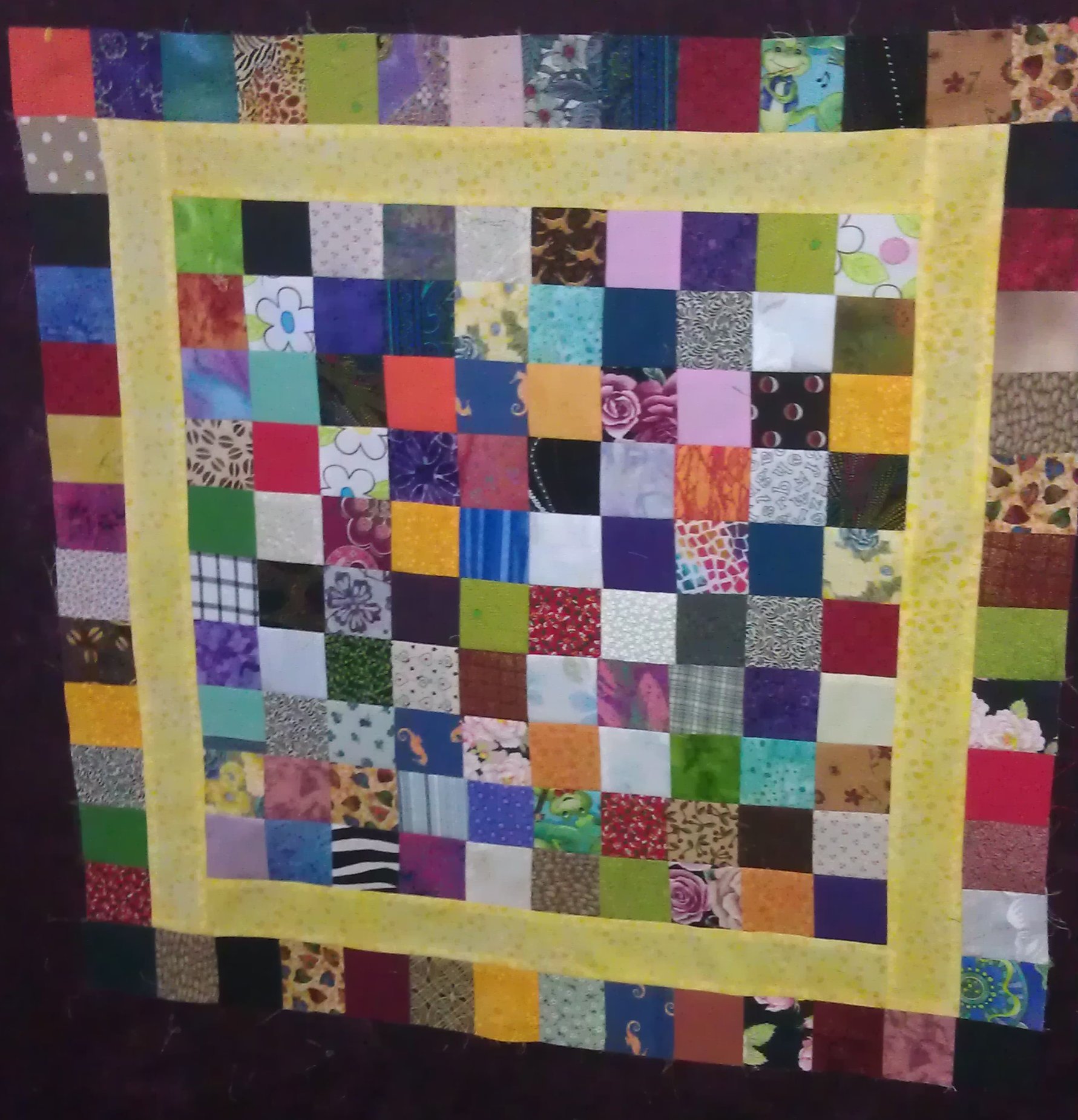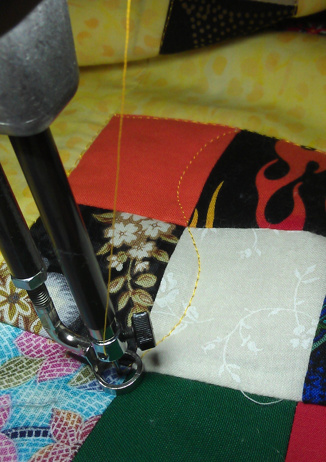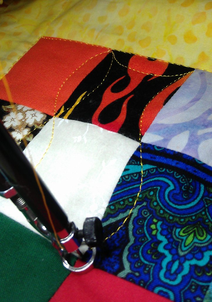 I have LOTS of 2″ squares in my scrappy quilt — probably about 500. As all the fabrics are a mixed bag (batiks, cottons, fabric from old clothes, cheap fabrics, expensive fabrics, stiff fabrics, fraying fabrics, etc.), I wanted to stitch a quilting design that held them all down as much as possible and that secured the seams and joins as far as possible, while also creating a rounded effect against the stark geometry of the squares. I decided on the cathedral window quilting motif (shown finished below), and took photos as I went to explain how to do it super simply.