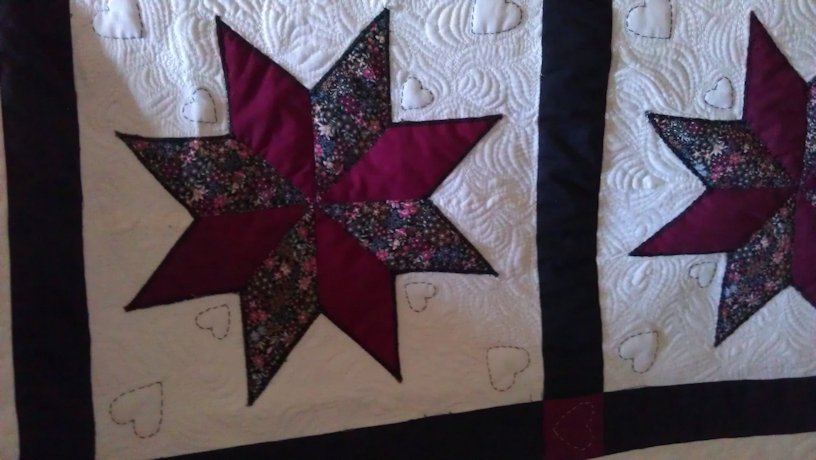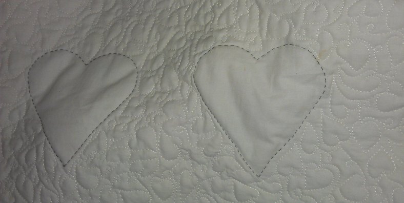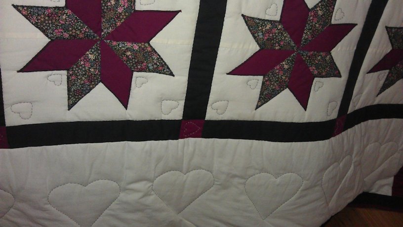 For the main border, I stitched lots of hearts and loops, again leaving the big hearts and the hand stitching for those. I didn’t quilt the black sashing strips or the maroon keystone pieces (in the sashing and the main border).